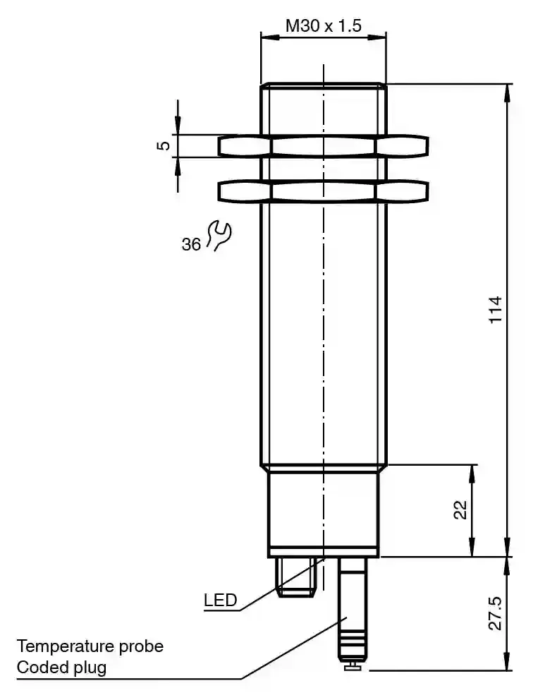 Ultrasonic sensor. Single head system, Parameterization interface for the application-specific adjustment of the sensor setting via the service program ULTRA 3000, Analog current and voltage output, Synchronization options, Series: UC-30GM, Operating voltage: 10 … 30 V DC , ripple 10 %SS, Interface type: RS 232, 9600 Bit/s , no parity, 8 data bits, 1 stop bit, Output type: 1 current output 4 … 20 mA1 voltage output 0 … 10 V, UL approval: cULus Listed, General Purpose. Sensing range: 80 … 2000 mm. Adjustment range: 120 … 2000 mm. Dead band: 0 … 80 mm. Standard target plate: 100 mm x 100 mm. Transducer frequency: approx. 180 kHz. Response delay: 65 ms minimum195 ms factory setting. LED green: solid: Power-onflashing: Standby mode or program function object detected. LED yellow 1: solid: object in evaluation rangeflashing: program function. LED yellow 2: solid: object in detection rangeflashing: program function. LED red: solid: temperature/program plug not connectedflashing: fault or program function object not detected. Temperature/teach-in connector: Temperature compensation , Evaluation range programming , output function setting. Operating voltage: 10 … 30 V DC , ripple 10 %SS. Power consumption: ≤ 900 mW. Time delay before availability: ≤ 500 ms. Interface type: RS 232, 9600 Bit/s , no parity, 8 data bits, 1 stop bit. Synchronization: bi-directional0 level -UB…+1 V1 level: +4 V…+UB input impedance: > 12 KOhmsynchronization pulse: ≥ 100 µs, synchronization interpulse period: ≥ 2 ms. Synchronization frequency: . Common mode operationmax. 30 HzMultiplex operation≤ 30 Hz / n , n = number of sensors , n ≤ 5: . Common mode operation: max. 30 Hz. Multiplex operation: ≤ 30 Hz / n , n = number of sensors , n ≤ 5. Output type: 1 current output 4 … 20 mA1 voltage output 0 … 10 V. Resolution: evaluation range [mm]/4000, but ≥ 0.35 mm. Deviation of the characteristic curve: ≤ 0.2 % of full-scale value. Repeat accuracy: ≤ 0.1 % of full-scale value. Load impedance: current output: ≤ 500 Ohm voltage output: ≥ 1000 Ohm. Temperature influence: ≤ 2 % from full-scale value (with temperature compensation)≤ 0.2 %/K (without temperature compensation). Standard conformity: . StandardsEN IEC 60947-5-2:2020 IEC 60947-5-2:2019 EN 60947-5-7:2003 IEC 60947-5-7:2003: . Standards: EN IEC 60947-5-2:2020 IEC 60947-5-2:2019 EN 60947-5-7:2003 IEC 60947-5-7:2003. UL approval: cULus Listed, General Purpose. CCC approval: CCC approval / marking not required for products rated ≤36 V. Ambient temperature: -25 … 70 °C (-13 … 158 °F). Storage temperature: -40 … 85 °C (-40 … 185 °F). Connection type: Connector plug M12 x 1 , 5-pin. Degree of protection: IP65. Material: . Housingstainless steel (1.4305 / AISI 303)PBT plastic partsTransducerepoxy resin/hollow glass sphere mixture; polyurethane foam: . Housing: stainless steel (1.4305 / AISI 303)PBT plastic parts. Transducer: epoxy resin/hollow glass sphere mixture; polyurethane foam. Mass: 170 g. Dimensions: . Length114 mmDiameter30 mm: . Length: 114 mm. Diameter: 30 mm. Output: evaluation limit A1: 200 mm evaluation limit A2: 2000 mm rising ramp