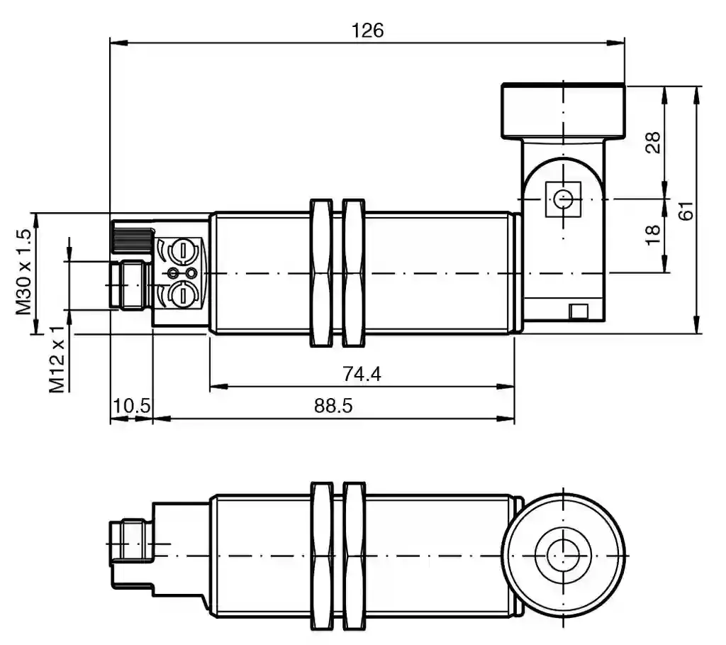 Ultrasonic sensor. Ultrasonic diffuse sensor with pivoting transducer, 2 switch outputs, Synchronization options, Temperature compensation, Series: UC-30GM70, Rated operating voltage: 24 V DC, Operating voltage: 12 … 30 V DC (including ripple), Interface type: Infrared, Output type: 2 switch outputs PNP, NO ( NC contact programmable ), UL approval: cULus Listed, Class 2 Power Source, CCC approval: CCC approval / marking not required for products rated ≤36 V, Connection type: Connector plug M12 x 1 , 5-pin. Sensing range: 45 … 500 mm. Adjustment range: 50 … 500 mm. Dead band: 0 … 45 mm. Standard target plate: 100 mm x 100 mm. Transducer frequency: approx. 300 kHz. Response delay: ≤ 60 ms. Temperature drift: ≤ ± 1.5 % of full-scale value. Time delay before availability: ≤ 85 ms. Permissible cable length: max. 300 m. LED yellow: solid Switching state switch output 1. LED green/yellow: yellow: switching state switch output 2 green: Teach-In. Potentiometer: Switching output 1 and Switching output 2 adjustable. Rated operating voltage: 24 V DC. Operating voltage: 12 … 30 V DC (including ripple). Ripple: ≤ 10 %. No-load supply current: ≤ 50 mA. Interface type: Infrared. Mode: point-to-point connection. Input/output type: 1 synchronization connection, bidirectional ( Factory setting: synchronized mode ) / Teach-In input. 0 Level≤ 3 V1 Level≥ 15 VInput impedancetyp. 900 ΩNumber of sensorsmax. 10: . 0 Level: ≤ 3 V. 1 Level: ≥ 15 V. Input impedance: typ. 900 Ω. Number of sensors: max. 10. Output type: 2 switch outputs PNP, NO ( NC contact programmable ). Default setting: 50 … 500 mm ( adjustable via potentiometer ). Repeat accuracy: ± 0.5 mm. Operating current: per 150 mA , short-circuit/overload protected. Switching frequency: ≤ 5 Hz. Switching hysteresis: 5 mm ( programmable ). Voltage drop: ≤ 3 V. Off-state current: ≤ 10 µA. Standard conformity: . StandardsEN IEC 60947-5-2:2020 IEC 60947-5-2:2019: . Standards: EN IEC 60947-5-2:2020 IEC 60947-5-2:2019. UL approval: cULus Listed, Class 2 Power Source. CCC approval: CCC approval / marking not required for products rated ≤36 V. Ambient temperature: -25 … 70 °C (-13 … 158 °F). Storage temperature: -40 … 85 °C (-40 … 185 °F). Shock resistance: 30 g , 11 ms period. Vibration resistance: 10 … 55 Hz , Amplitude ± 1 mm. Connection type: Connector plug M12 x 1 , 5-pin. Degree of protection: IP65. Material: . Housingbrass, nickel-platedTransducerepoxy resin/hollow glass sphere mixture; polyurethane foam: . Housing: brass, nickel-plated. Transducer: epoxy resin/hollow glass sphere mixture; polyurethane foam. Installation position: any position. Mass: 170 g. Dimensions: . Length126 mmDiameter30 mm: . Length: 126 mm. Diameter: 30 mm. Construction type: Cylindrical