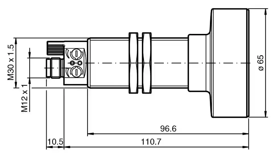 Ultrasonic sensor. Ultrasonic direct detection sensor, 2 switch outputs, Synchronization options, Temperature compensation, Series: UC-30GM70, Rated operating voltage: 24 V DC, Operating voltage: 12 … 30 V DC (including ripple), Interface type: Infrared, Output type: 2 switch outputs PNP, NO ( NC contact programmable ), UL approval: cULus Listed, Class 2 Power Source, CCC approval: CCC approval / marking not required for products rated ≤36 V, Connection type: Connector plug M12 x 1 , 5-pin. Sensing range: 350 … 6000 mm. Adjustment range: 400 … 6000 mm. Dead band: 0 … 350 mm. Standard target plate: 100 mm x 100 mm. Transducer frequency: approx. 80 kHz. Response delay: ≤ 275 ms. Temperature drift: ≤ ± 1.5 % of full-scale value. Time delay before availability: ≤ 300 ms. Permissible cable length: max. 300 m. LED yellow: solid Switching state switch output 1. LED green/yellow: yellow: switching state switch output 2 green: Teach-In. Potentiometer: Switching output 1 and Switching output 2 adjustable. Rated operating voltage: 24 V DC. Operating voltage: 12 … 30 V DC (including ripple). Ripple: ≤ 10 %. No-load supply current: ≤ 50 mA. Interface type: Infrared. Mode: point-to-point connection. Input/output type: 1 synchronization connection, bidirectional ( Factory setting: synchronized mode ) / Teach-In input. 0 Level≤ 3 V1 Level≥ 15 VInput impedancetyp. 900 ΩNumber of sensorsmax. 10: . 0 Level: ≤ 3 V. 1 Level: ≥ 15 V. Input impedance: typ. 900 Ω. Number of sensors: max. 10. Output type: 2 switch outputs PNP, NO ( NC contact programmable ). Default setting: 400 … 6000 mm ( adjustable via potentiometer ). Repeat accuracy: ± 9 mm. Operating current: per 150 mA , short-circuit/overload protected. Switching frequency: ≤ 1 Hz. Switching hysteresis: 60 mm ( programmable ). Voltage drop: ≤ 3 V. Off-state current: ≤ 10 µA. Standard conformity: . StandardsEN IEC 60947-5-2:2020 IEC 60947-5-2:2019: . Standards: EN IEC 60947-5-2:2020 IEC 60947-5-2:2019. UL approval: cULus Listed, Class 2 Power Source. CCC approval: CCC approval / marking not required for products rated ≤36 V. Ambient temperature: -25 … 70 °C (-13 … 158 °F). Storage temperature: -40 … 85 °C (-40 … 185 °F). Shock resistance: 30 g , 11 ms period. Vibration resistance: 10 … 55 Hz , Amplitude ± 1 mm. Connection type: Connector plug M12 x 1 , 5-pin. Degree of protection: IP65. Material: . Housingbrass, nickel-platedTransducerepoxy resin/hollow glass sphere mixture; polyurethane foam: . Housing: brass, nickel-plated. Transducer: epoxy resin/hollow glass sphere mixture; polyurethane foam. Installation position: any position. Mass: 280 g. Dimensions: . Length121.2 mmDiameter30 mm: . Length: 121.2 mm. Diameter: 30 mm. Construction type: Cylindrical
