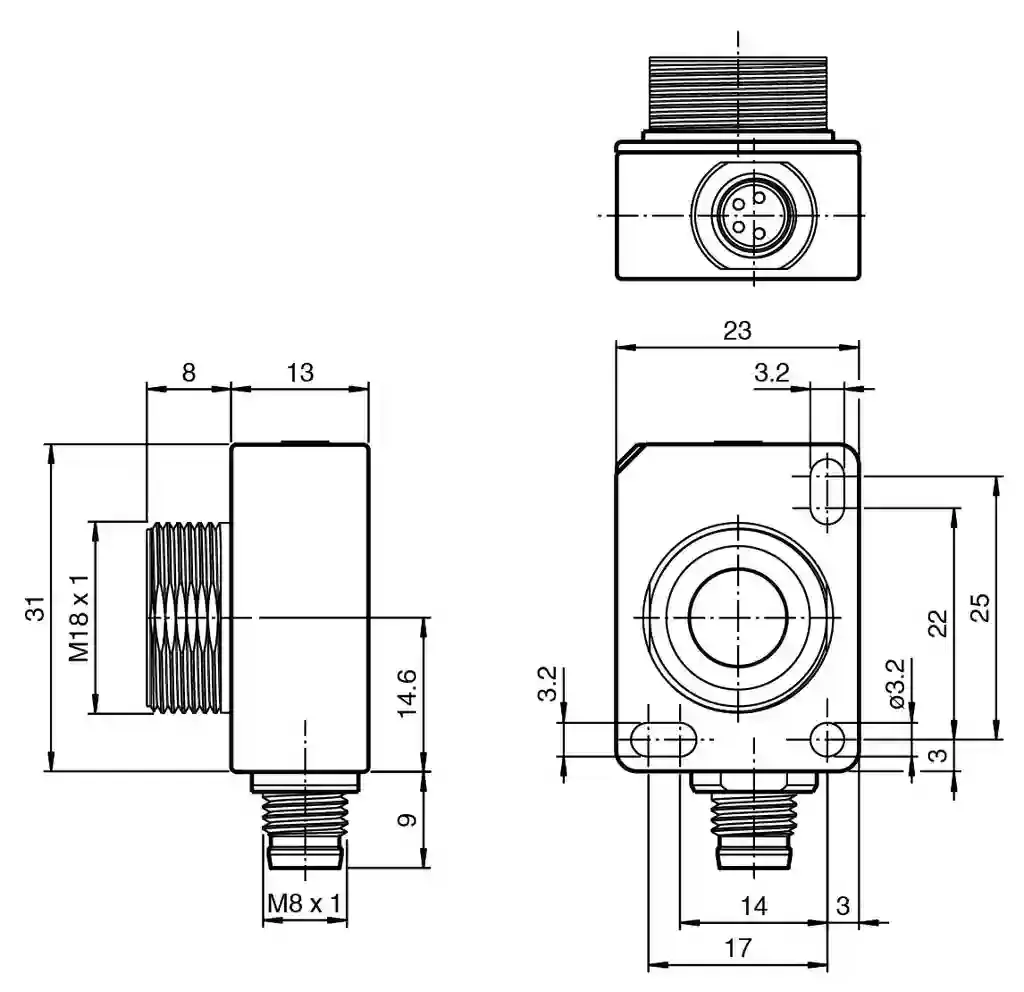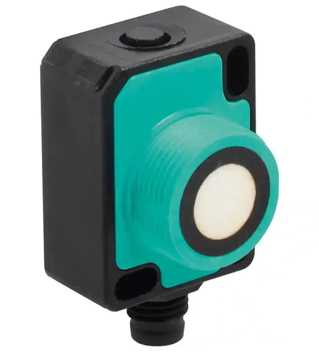 Ultrasonic sensor. Single head system, IO-Link interface for parameterization, Programmable via DTM with PACTWARE, Selectable sound lobe width, Series: -F77, Operating voltage: 18 … 30 V DC , ripple 10 %SS , Interface type: IO-Link (available after activation via programming button until next reset), Output type: 1 analog output 0 (4) … 20 mA or 1 analog output 0 … 10 V, UL approval: cULus Listed, Class 2 Power Source. Sensing range: 60 … 800 mm. Adjustment range: 70 … 800 mm. Dead band: 0 … 60 mm. Standard target plate: 100 mm x 100 mm. Transducer frequency: approx. 255 kHz. Response delay: minimum : 13 ms factory setting: 49 ms. Sensor cycle time: ≥ 13 ms (factory setting) ; programmable to 60 s. Non-volatile memory: EEPROM. Write cycles: 300000. LED green: solid: power onflashing: standby mode or IO-Link communication. LED yellow: solid: object in evaluation rangeflashing: programming of the limits, object detected. LED red: solid: faultflashing: programming limits, object not detected. Operating voltage: 18 … 30 V DC , ripple 10 %SS. No-load supply current: ≤ 50 mA. Power consumption: ≤ 500 mW. Time delay before availability: ≤ 300 ms. Interface type: IO-Link (available after activation via programming button until next reset). Input/output type: 1 synchronization connection, bidirectional. 0 Level0 … 1 V1 Level2.5 V … UBInput impedance> 22 kΩOutput currentcurrent source 22 kΩ. Output current: current source < 2.5 mA. Pulse length: ≥ 1 ms with external control, low active. Synchronization frequency: . Common mode operation≤ 82 HzMultiplex operation≤ 82 Hz / n , n = number of sensors , n ≤ 10: . Common mode operation: ≤ 82 Hz. Multiplex operation: ≤ 82 Hz / n , n = number of sensors , n ≤ 10. Output type: 1 analog output 0 (4) … 20 mA or 1 analog output 0 … 10 V. Resolution: current output: evaluation range [mm]/3200 but ≥ 0.35 mmvoltage output: evaluation range [mm]/4000 but ≥ 0.35 mm. Deviation of the characteristic curve: ≤ ± 1 % of full-scale value. Repeat accuracy: ≤ ± 0.1 % of full-scale value. Load impedance: current output: ≤ 500 Ohm voltage output: ≥ 1000 Ohm. Temperature influence: ≤ ± 0.75 % of the end value (with temperature compensation) from 10 minutes after switching on the sensor ; 0.17 %/K (without temperature compensation). Standard conformity: . StandardsEN IEC 60947-5-2:2020 IEC 60947-5-2:2019 EN 60947-5-7:2003 IEC 60947-5-7:2003 IEC 61131-9:2013: . Standards: EN IEC 60947-5-2:2020 IEC 60947-5-2:2019 EN 60947-5-7:2003 IEC 60947-5-7:2003 IEC 61131-9:2013. UL approval: cULus Listed, Class 2 Power Source. CCC approval: CCC approval / marking not required for products rated ≤36 V. Ambient temperature: current output -25 … 60 °C (-13 … 140 °F) voltage output -25 … 70 °C (-13 … 158 °F) When fixing with one M18 nut, the temperature range for each begins with 0 °C (32 °F).. Storage temperature: -40 … 85 °C (-40 … 185 °F). Connection type: Connector plug M8 x 1 , 4-pin. Degree of protection: IP67. Material: . HousingPolycarbonateTransducerepoxy resin/hollow glass sphere mixture; polyurethane foam: . Housing: Polycarbonate. Transducer: epoxy resin/hollow glass sphere mixture; polyurethane foam. Installation position: any position. Mass: 13 g. Tightening torque, fastening screws: with M3 nuts max. 0.2 Nm with M18 nuts max. 1 Nm. Dimensions: . Height31 mmWidth21 mmLength23 mm: . Height: 31 mm. Width: 21 mm. Length: 23 mm. Output: near limit: 70 mm far limit: 800 mm Output mode: rising ramp output type: 4 … 20 mA. Beam width: wide. Scope of delivery: 1 Nut plastic