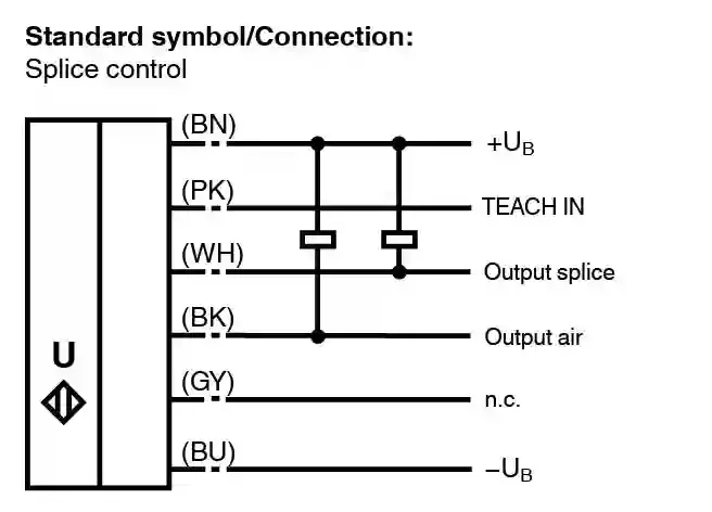 Splice sensor. Ultrasonic system for splice detection, Short version, Insensitive to printing, colors, and shining surfaces, Sensing range: 20 … 60 mm , optimal distance: 45 mm, Thread mold: M18, Construction type: Cylindrical, thread, Series: UGB-18GM, Operating voltage: 18 … 30 V DC , ripple 10 %SS, Output type: 2 switch outputs NPN, NC, UL approval: cULus Listed, General Purpose, CCC approval: CCC approval / marking not required for products rated ≤36 V, Connection type: cable PVC , 2 m. Sensing range: 20 … 60 mm , optimal distance: 45 mm. Transducer frequency: 255 kHz. LED green: Display: readiness. LED yellow: Display: splice detected. LED red: indication: no sheet detected (Air). Operating voltage: 18 … 30 V DC , ripple 10 %SS. No-load supply current: < 60 mA. Time delay before availability: < 500 ms. Input type: Teach-In input 0-level: -UB … -UB + 1V1-level: +UB – 1 V … +UB. Pulse length: ≥ 500 ms. Impedance: ≥ 10 kΩ. Output type: 2 switch outputs NPN, NC. Rated operating current: 2 x 100 mA , short-circuit/overload protected. Voltage drop: ≤ 3 V. Switch-on delay: ≤ 600 µs. Switch-off delay: ≤ 600 µs. Pulse extension: ≥ 120 ms programmable. Standard conformity: . StandardsEN IEC 60947-5-2:2020 IEC 60947-5-2:2019: . Standards: EN IEC 60947-5-2:2020 IEC 60947-5-2:2019. UL approval: cULus Listed, General Purpose. CCC approval: CCC approval / marking not required for products rated ≤36 V. Ambient temperature: 0 … 60 °C (32 … 140 °F). Storage temperature: -40 … 70 °C (-40 … 158 °F). Connection type: cable PVC , 2 m. Core cross section: 0.14 mm2. Degree of protection: IP67. Material: . Housingnickel plated brass; plastic components: PBTTransducerepoxy resin/hollow glass sphere mixture; polyurethane foam: . Housing: nickel plated brass; plastic components: PBT. Transducer: epoxy resin/hollow glass sphere mixture; polyurethane foam. Mass: 150 g. Dimensions: . Length53 mmDiameter18 mm: . Length: 53 mm. Diameter: 18 mm