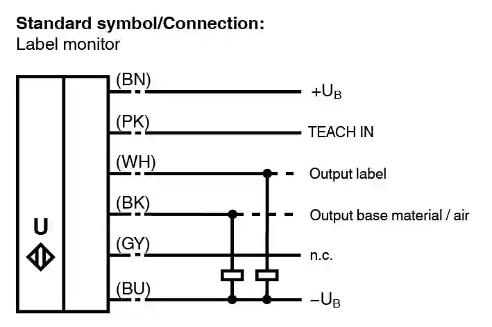 Label sensor. Ultrasonic system for detection of labels and carrier materials., Short version, Insensitive to printing, colors, and shining surfaces, Sensing range: 20 … 60 mm , optimal distance: 45 mm, Thread mold: M18, Construction type: Cylindrical, thread, Series: ULB-18GM, Operating voltage: 18 … 30 V DC , ripple 10 %SS, Output type: 2 switch outputs PNP, NC, UL approval: C-UL listed: 57M3, IND CONT. EQ., “Powered by Class 2 Power Source”. Sensing range: 20 … 60 mm , optimal distance: 45 mm. Transducer frequency: 255 kHz. LED green: Display: readiness. LED yellow: indication: label detected. LED red: Display: error. Operating voltage: 18 … 30 V DC , ripple 10 %SS. No-load supply current: < 60 mA. Time delay before availability: < 500 ms. Input type: Teach-In input 0-level: -UB … -UB + 1V1-level: +UB – 1 V … +UB. Pulse length: ≥ 500 ms. Impedance: ≥ 10 kΩ. Output type: 2 switch outputs PNP, NC. Rated operating current: 2 x 100 mA , short-circuit/overload protected. Voltage drop: ≤ 3 V. Switch-on delay: ≤ 600 µs. Switch-off delay: ≤ 600 µs. Standard conformity: . StandardsEN IEC 60947-5-2:2020 IEC 60947-5-2:2019: . Standards: EN IEC 60947-5-2:2020 IEC 60947-5-2:2019. UL approval: C-UL listed: 57M3, IND CONT. EQ., "Powered by Class 2 Power Source". CCC approval: CCC approval / marking not required for products rated ≤36 V. Ambient temperature: 0 … 60 °C (32 … 140 °F). Storage temperature: -40 … 70 °C (-40 … 158 °F). Connection type: cable PVC , 2 m. Core cross section: 0.14 mm2. Degree of protection: IP67. Material: . Housingnickel plated brass; plastic components: PBTTransducerepoxy resin/hollow glass sphere mixture; polyurethane foam: . Housing: nickel plated brass; plastic components: PBT. Transducer: epoxy resin/hollow glass sphere mixture; polyurethane foam. Mass: 150 g. Dimensions: . Length53 mmDiameter18 mm: . Length: 53 mm. Diameter: 18 mm