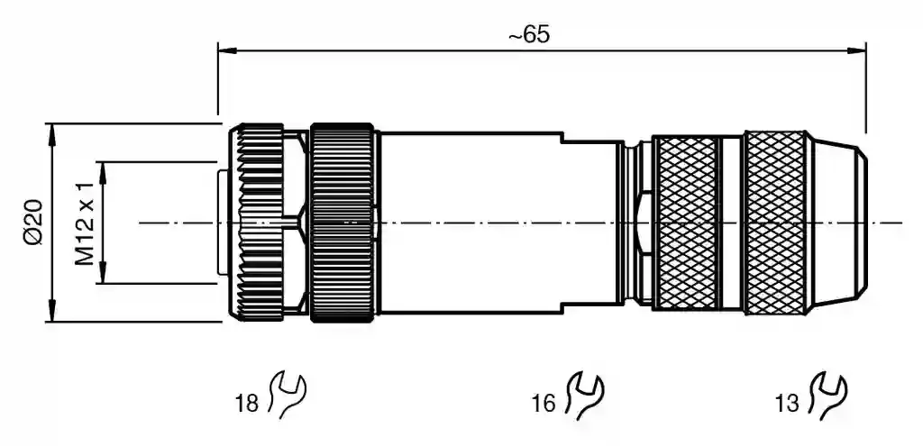 Female connector, field-attachable. Female connector M12 straight A-coded 4-pin, for cable diameter 5 – 8 mm, shielded, field-attachable. Connector 1: . ConnectionsocketConstruction typeM12StylestraightLockingscrew connectionNumber of pins4CodingA-coded: . Connection: socket. Construction type: M12. Style: straight. Locking: screw connection. Number of pins: 4. Coding: A-coded. Operating voltage: max. 250 V AC/DC. Operating current: 4 A. Insulation resistance: min. 100 MΩ. Degree of protection: EN 60529. Plug connection: connector M12 x 1 : IEC 61076-2-101. UL File Number: E363587. Ambient temperature: -40 … 85 °C (-40 … 185 °F). Pollution degree: 3. Plug connector: . Tightening torque0.6 NmTool installationstraight knurling , hexagon nut SW = 18 mmMating cyclesmin. 100Shieldingiris spring shielding: . Tightening torque: 0.6 Nm. Tool installation: straight knurling , hexagon nut SW = 18 mm. Mating cycles: min. 100. Shielding: iris spring shielding. Degree of protection: IP67. Connection: screw terminals for max. 0.75 mm2 / AWG 18. Cable: . Sheath diameter5 … 8 mmCore cross section0.75 mm2 / 18 AWG max.: . Sheath diameter: 5 … 8 mm. Core cross section: 0.75 mm2 / 18 AWG max.. Mass: 48.6 g. Plug connector: . Screw connectionZinc diecast, nickel-platedBodyZinc diecast, nickel-platedSealNBR , FKMContact surfaceAu: . Screw connection: Zinc diecast, nickel-plated. Body: Zinc diecast, nickel-plated. Seal: NBR , FKM. Contact surface: Au