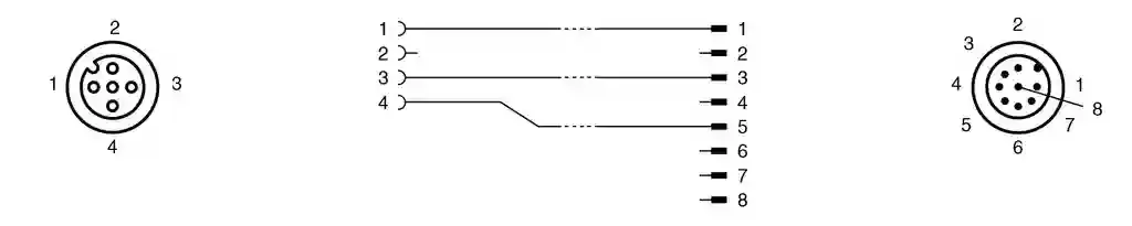 Connection cable. Cordset M12 socket straight A-coded 4-pin to M12 plug straight A-coded 8-pin, PUR cable 3-core black, UL approved, drag chain suitable, torsion resistant. Connector 1: . ConnectionsocketConstruction typeM12StylestraightLockingscrew connectionNumber of pins4CodingA-coded: . Connection: socket. Construction type: M12. Style: straight. Locking: screw connection. Number of pins: 4. Coding: A-coded. Connector 2: . ConnectionplugConstruction typeM12StylestraightLockingscrew connectionNumber of pins8CodingA-coded: . Connection: plug. Construction type: M12. Style: straight. Locking: screw connection. Number of pins: 8. Coding: A-coded. Operating voltage: max. 30 V AC/DC. Operating current: max. 2 A. Degree of protection: EN 60529. Plug connection: connector M12 x 1 : IEC 61076-2-101. Flammability: UL 1581; DIN EN 60332-2-2. Halogen-free: IEC 60754-1. UL approval: AWM STYLE 20549 AWM I/II A/B 80°C 300V FT2 (cable). UL File Number: E231213. Ambient temperature: . Plug connector-40 … 90 °C (-40 … 194 °F)Cable, fixed installation-40 … 80 °C (-40 … 176 °F)Cable, flexing-20 … 80 °C (-4 … 176 °F): . Plug connector: -40 … 90 °C (-40 … 194 °F). Cable, fixed installation: -40 … 80 °C (-40 … 176 °F). Cable, flexing: -20 … 80 °C (-4 … 176 °F). Pollution degree: 3. Plug connector: . Tightening torque0.6 NmLoosening protectionintegratedTool installationstraight knurling and hexagon nut SW = 14 mmMating cyclesmin. 100: . Tightening torque: 0.6 Nm. Loosening protection: integrated. Tool installation: straight knurling and hexagon nut SW = 14 mm. Mating cycles: min. 100. Degree of protection: IP67 / IP68 / IP69. Cable: according to IEC/EN 60228 (DIN VDE 0295) class 6. Sheath diameter4.3 mmBending radius> 10 x cable diameter, movable installation > 5 x cable diameter, fixed installationSheath stripping forcemax. 80 N / 300 mmSheath colorblack (similar to RAL 9005)Number of cores3Core cross section0.34 mm2Cores colorCore 1-1: brown Core 3-3: blue Core 4-5: blackCore construction42 x 0.1 mm ∅LengthL0.15 mCable codeLi F 9Y 11Y 3 x 0,34: . Sheath diameter: 4.3 mm. Bending radius: > 10 x cable diameter, movable installation > 5 x cable diameter, fixed installation. Sheath stripping force: max. 80 N / 300 mm. Sheath color: black (similar to RAL 9005). Number of cores: 3. Core cross section: 0.34 mm2. Cores color: Core 1-1: brown Core 3-3: blue Core 4-5: black. Core construction: 42 x 0.1 mm ∅. Length: 0.15 m. Cable code: Li F 9Y 11Y 3 x 0,34. Drag chain suitability: . Test temperature25 °C (77 °F)Drag chain cyclesmin. 10000000Motion velocitymax. 3 m/sTraverse distancemax. 5 mAccelerationmax. 5 m/s2Torsion cyclesmin. 1000000Torsional stress± 180 °/m: . Test temperature: 25 °C (77 °F). Drag chain cycles: min. 10000000. Motion velocity: max. 3 m/s. Traverse distance: max. 5 m. Acceleration: max. 5 m/s2. Torsion cycles: min. 1000000. Torsional stress: ± 180 °/m. Mass: 25.71 g. PWIS free: yes. Halogen-free: yes. Plug connector: . Screw connectionZinc diecast, nickel-platedBodyTPU, blackSealFKMContact surfacegold plated (Au)FlammabilityV-2: . Screw connection: Zinc diecast, nickel-plated. Body: TPU, black. Seal: FKM. Contact surface: gold plated (Au). Flammability: V-2. Cable: . SheathingPUR based on polyetherCoresbare copper (Cu)Core insulationPPUV resistanceyesChemical resistancegoodOil resistanceyesCooling lubricant resistanceyesMicrobial resistanceyesHydrolysis resistanceyesFlammabilityFT2: . Sheathing: PUR based on polyether. Cores: bare copper (Cu). Core insulation: PP. UV resistance: yes. Chemical resistance: good. Oil resistance: yes. Cooling lubricant resistance: yes. Microbial resistance: yes. Hydrolysis resistance: yes. Flammability: FT2. Cable marking sleeve: 2x PUR transparent , fixed to cable
