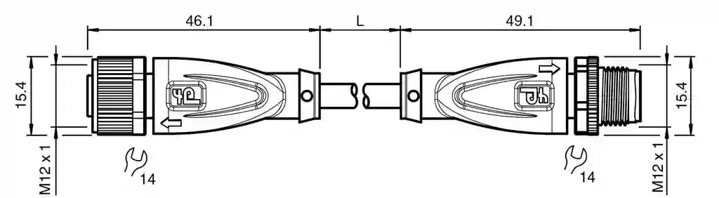 Connection cable. Cordset M12 socket straight to M12 plug straight A-coded, 4-pin, PUR cable black, UL-approved, drag chain suitable, torsion resistant. Connector 1: . ConnectionsocketConstruction typeM12StylestraightLockingscrew connectionNumber of pins4CodingA-coded: . Connection: socket. Construction type: M12. Style: straight. Locking: screw connection. Number of pins: 4. Coding: A-coded. Connector 2: . ConnectionplugConstruction typeM12StylestraightLockingscrew connectionNumber of pins4CodingA-coded: . Connection: plug. Construction type: M12. Style: straight. Locking: screw connection. Number of pins: 4. Coding: A-coded. Operating voltage: max. 250 V AC/DC. Operating current: max. 4 A. Degree of protection: EN 60529. Plug connection: connector M12 x 1 : IEC 61076-2-101. Flammability: UL 1581; DIN EN 60332-2-2. Halogen-free: IEC 60754-1. UL approval: AWM STYLE 20549 AWM I/II A/B 80°C 300V FT2 (cable). UL File Number: E231213. Ambient temperature: . Plug connector-40 … 90 °C (-40 … 194 °F)Cable, fixed installation-40 … 80 °C (-40 … 176 °F)Cable, flexing-20 … 80 °C (-4 … 176 °F): . Plug connector: -40 … 90 °C (-40 … 194 °F). Cable, fixed installation: -40 … 80 °C (-40 … 176 °F). Cable, flexing: -20 … 80 °C (-4 … 176 °F). Pollution degree: 3. Plug connector: . Tightening torque0.6 NmLoosening protectionavailableTool installationstraight knurling and hexagon nut SW = 14 mmMating cyclesmin. 100: . Tightening torque: 0.6 Nm. Loosening protection: available. Tool installation: straight knurling and hexagon nut SW = 14 mm. Mating cycles: min. 100. Degree of protection: IP68 / IP69. Cable: according to IEC/EN 60228 (DIN VDE 0295) class 6. Sheath diameter4.3 mmBending radius> 10 x cable diameter, movable installation > 5 x cable diameter, fixed installationSheath stripping forcemax. 80 N / 300 mmSheath colorblack (similar to RAL 9005)Number of cores4Core cross section0.34 mm2Cores colorCore 1: brown Core 2: white Core 3: blue Core 4: blackCore construction42 x 0.1 mm ∅LengthL10 mCable codeLi 9Y 11Y 4 x 0.34: . Sheath diameter: 4.3 mm. Bending radius: > 10 x cable diameter, movable installation > 5 x cable diameter, fixed installation. Sheath stripping force: max. 80 N / 300 mm. Sheath color: black (similar to RAL 9005). Number of cores: 4. Core cross section: 0.34 mm2. Cores color: Core 1: brown Core 2: white Core 3: blue Core 4: black. Core construction: 42 x 0.1 mm ∅. Length: 10 m. Cable code: Li 9Y 11Y 4 x 0.34. Drag chain suitability: . Drag chain cyclesmin. 5000000Motion velocitymax. 3.3 m/sTraverse distancemax. 5 mAccelerationmax. 5 m/s2Torsion cyclesmin. 1000000Torsional stress± 180 °/m: . Drag chain cycles: min. 5000000. Motion velocity: max. 3.3 m/s. Traverse distance: max. 5 m. Acceleration: max. 5 m/s2. Torsion cycles: min. 1000000. Torsional stress: ± 180 °/m. Mass: 255.3 g. PWIS free: yes. Halogen-free: yes. Plug connector: . Screw connectionZinc diecast, nickel-platedBodyTPU, blackSealFKMContact surfacegold plated (Au)FlammabilityV-2: . Screw connection: Zinc diecast, nickel-plated. Body: TPU, black. Seal: FKM. Contact surface: gold plated (Au). Flammability: V-2. Cable: . SheathingPUR based on polyetherCore insulationPPUV resistanceyesChemical resistancegoodOil resistanceyesCooling lubricant resistanceyesMicrobial resistanceyesHydrolysis resistanceyesFlammabilityFT2: . Sheathing: PUR based on polyether. Core insulation: PP. UV resistance: yes. Chemical resistance: good. Oil resistance: yes. Cooling lubricant resistance: yes. Microbial resistance: yes. Hydrolysis resistance: yes. Flammability: FT2