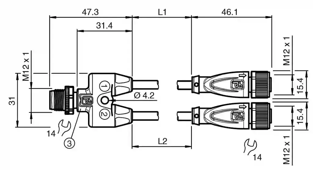 Y connection cable. Y connection cable M12 plug straight A-coded 4-pin to 2x M12 socket straight A-coded 4-pin, 2x PUR cable welding-bead resistant yellow, UL approved, drag chain suitable, torsion resistant. Connector 1: . ConnectionsocketConstruction typeM12StylestraightLockingscrew connectionNumber of pins4CodingA-coded: . Connection: socket. Construction type: M12. Style: straight. Locking: screw connection. Number of pins: 4. Coding: A-coded. Connector 2: . ConnectionsocketConstruction typeM12StylestraightLockingscrew connectionNumber of pins4CodingA-coded: . Connection: socket. Construction type: M12. Style: straight. Locking: screw connection. Number of pins: 4. Coding: A-coded. Connector 3: . ConnectionplugConstruction typeM12StylestraightLockingscrew connectionNumber of pins4CodingA-coded: . Connection: plug. Construction type: M12. Style: straight. Locking: screw connection. Number of pins: 4. Coding: A-coded. Operating voltage: max. 30 V AC/DC. Operating current: max. 4 A. Degree of protection: EN 60529. Plug connection: connector M12 x 1 : IEC 61076-2-101. Flammability: UL 1581; DIN EN 60332-2-2. Halogen-free: DIN VDE 0472-815. Microbial resistance: DIN EN 50525-2-21 / DIN VDE 0282-10. Hydrolysis resistance: DIN EN 50525-2-21. UL approval: AWM STYLE 20549 AWM I/II A/B 80°C 300V FT2 (cable). UL File Number: E231213. Ambient temperature: . Plug connector-40 … 90 °C (-40 … 194 °F)Cable, fixed installation-40 … 80 °C (-40 … 176 °F)Cable, flexing-25 … 80 °C (-13 … 176 °F): . Plug connector: -40 … 90 °C (-40 … 194 °F). Cable, fixed installation: -40 … 80 °C (-40 … 176 °F). Cable, flexing: -25 … 80 °C (-13 … 176 °F). Pollution degree: 3. Plug connector: . Tightening torque0.6 NmLoosening protectionavailableTool installationstraight knurling and hexagon nut SW = 14 mmMating cyclesmin. 100: . Tightening torque: 0.6 Nm. Loosening protection: available. Tool installation: straight knurling and hexagon nut SW = 14 mm. Mating cycles: min. 100. Degree of protection: IP68 / IP69. Cable: according to IEC/EN 60228 (DIN VDE 0295) class 6. Sheath diameter5.3 mmBending radius> 10 x cable diameter, movable installation > 5 x cable diameter, fixed installationSheath stripping forcemax. 80 N / 300 mmSheath coloryellow (similar to RAL 1021)Number of cores5Core cross section0.34 mm2Cores colorCore 1: brown Core 2: white Core 3: blue Core 4: black Core 5: not usedCore construction42 x 0.1 mm ∅LengthLL1 = 0.6 m L2 = 0.6 mCable codeLi F 9Y 11Y 5 x 0,34: . Sheath diameter: 5.3 mm. Bending radius: > 10 x cable diameter, movable installation > 5 x cable diameter, fixed installation. Sheath stripping force: max. 80 N / 300 mm. Sheath color: yellow (similar to RAL 1021). Number of cores: 5. Core cross section: 0.34 mm2. Cores color: Core 1: brown Core 2: white Core 3: blue Core 4: black Core 5: not used. Core construction: 42 x 0.1 mm ∅. Length: L1 = 0.6 m L2 = 0.6 m. Cable code: Li F 9Y 11Y 5 x 0,34. Drag chain suitability: . Drag chain cyclesmin. 5000000Motion velocitymax. 3 m/sTraverse distancemax. 5 mAccelerationmax. 5 m/s2Torsion cyclesmin. 1000000Torsional stress± 180 °/m: . Drag chain cycles: min. 5000000. Motion velocity: max. 3 m/s. Traverse distance: max. 5 m. Acceleration: max. 5 m/s2. Torsion cycles: min. 1000000. Torsional stress: ± 180 °/m. Mass: 71.45 g. PWIS free: yes. Halogen-free: yes. Plug connector: . Screw connectionZinc diecast, nickel-platedBodyTPU, blackSealFKMContact surfacegold plated (Au)FlammabilityV-2: . Screw connection: Zinc diecast, nickel-plated. Body: TPU, black. Seal: FKM. Contact surface: gold plated (Au). Flammability: V-2. Cable: . SheathingPUR based on polyetherCore insulationPPWelding-bead resistanceyesWeld spatter resistanceyesChemical resistancegoodOil resistanceyesCooling lubricant resistanceyesMicrobial resistanceyesHydrolysis resistanceyesFlammabilityFT2: . Sheathing: PUR based on polyether. Core insulation: PP. Welding-bead resistance: yes. Weld spatter resistance: yes. Chemical resistance: good. Oil resistance: yes. Cooling lubricant resistance: yes. Microbial resistance: yes. Hydrolysis resistance: yes. Flammability: FT2
