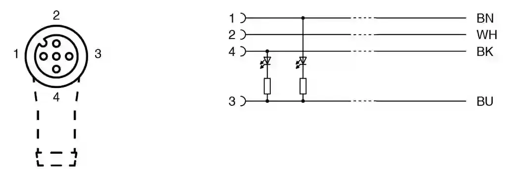 Female cordset. Female cordset single-ended M12 angled A-coded, LED 4-pin, PUR cable black, UL approved, drag chain suitable, torsion resistant. Connector 1: . ConnectionsocketConstruction typeM12StyleangledLockingscrew connectionNumber of pins4CodingA-coded: . Connection: socket. Construction type: M12. Style: angled. Locking: screw connection. Number of pins: 4. Coding: A-coded. Connector 2: . Connectioncable end: . Connection: cable end. LED green: Operating display. LED yellow: Functional display pin 4. Operating voltage: max. 24 V DC -20 % / +25 %. Operating current: max. 4 A. Degree of protection: EN 60529. Plug connection: connector M12 x 1 : IEC 61076-2-101. Flammability: UL 1581; DIN EN 60332-2-2. Halogen-free: IEC 60754-1. UL approval: AWM STYLE 20549 AWM I/II A/B 80°C 300V FT2 (cable). UL File Number: E231213. Ambient temperature: . Plug connector-40 … 90 °C (-40 … 194 °F)Cable, fixed installation-40 … 80 °C (-40 … 176 °F)Cable, flexing-20 … 80 °C (-4 … 176 °F): . Plug connector: -40 … 90 °C (-40 … 194 °F). Cable, fixed installation: -40 … 80 °C (-40 … 176 °F). Cable, flexing: -20 … 80 °C (-4 … 176 °F). Pollution degree: 3. Plug connector: . Tightening torque0.6 NmLoosening protectionintegratedTool installationstraight knurling and hexagon nut SW = 14 mmMating cyclesmin. 100: . Tightening torque: 0.6 Nm. Loosening protection: integrated. Tool installation: straight knurling and hexagon nut SW = 14 mm. Mating cycles: min. 100. Degree of protection: IP66 / IP68 / IP69. Cable: according to IEC/EN 60228 (DIN VDE 0295) class 6. Sheath diameter4.3 mmBending radius> 10 x cable diameter, movable installation > 5 x cable diameter, fixed installationSheath stripping forcemax. 80 N / 300 mmSheath colorblack (similar to RAL 9005)Number of cores4Core cross section0.34 mm2Cores colorCore 1: brown Core 2: white Core 3: blue Core 4: blackCore construction42 x 0.1 mm ∅LengthL15 mCable codeLi 9Y 11Y 4 x 0.34: . Sheath diameter: 4.3 mm. Bending radius: > 10 x cable diameter, movable installation > 5 x cable diameter, fixed installation. Sheath stripping force: max. 80 N / 300 mm. Sheath color: black (similar to RAL 9005). Number of cores: 4. Core cross section: 0.34 mm2. Cores color: Core 1: brown Core 2: white Core 3: blue Core 4: black. Core construction: 42 x 0.1 mm ∅. Length: 15 m. Cable code: Li 9Y 11Y 4 x 0.34. Drag chain suitability: . Test temperature25 °C (77 °F)Drag chain cyclesmin. 10000000Motion velocitymax. 3 m/sTraverse distancemax. 5 mAccelerationmax. 5 m/s2Torsion cyclesmin. 1000000Torsional stress± 180 °/m: . Test temperature: 25 °C (77 °F). Drag chain cycles: min. 10000000. Motion velocity: max. 3 m/s. Traverse distance: max. 5 m. Acceleration: max. 5 m/s2. Torsion cycles: min. 1000000. Torsional stress: ± 180 °/m. Mass: 393.92 g. PWIS free: yes. Halogen-free: yes. Plug connector: . Screw connectionZinc diecast, nickel-platedBodyTPU, transparentSealFKMContact surfacegold plated (Au)FlammabilityV-2: . Screw connection: Zinc diecast, nickel-plated. Body: TPU, transparent. Seal: FKM. Contact surface: gold plated (Au). Flammability: V-2. Cable: . SheathingPUR based on polyetherCoresbare copper (Cu)Core insulationPPUV resistanceyesChemical resistancegoodOil resistanceyesCooling lubricant resistanceyesMicrobial resistanceyesHydrolysis resistanceyesFlammabilityFT2: . Sheathing: PUR based on polyether. Cores: bare copper (Cu). Core insulation: PP. UV resistance: yes. Chemical resistance: good. Oil resistance: yes. Cooling lubricant resistance: yes. Microbial resistance: yes. Hydrolysis resistance: yes. Flammability: FT2. Cable marking sleeve: 2x PUR transparent , fixed to cable