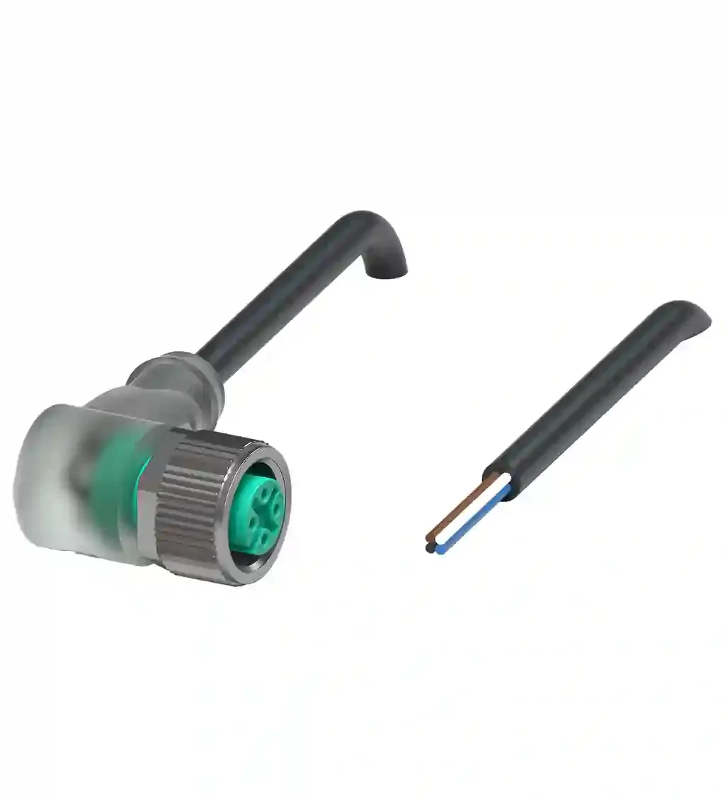 Female cordset. Female cordset single-ended M12 angled A-coded, LED 4-pin, PUR cable black, UL approved, drag chain suitable, torsion resistant. Connector 1: . ConnectionsocketConstruction typeM12StyleangledLockingscrew connectionNumber of pins4CodingA-coded: . Connection: socket. Construction type: M12. Style: angled. Locking: screw connection. Number of pins: 4. Coding: A-coded. Connector 2: . Connectioncable end: . Connection: cable end. LED green: Operating display. LED yellow: Functional display pin 4. Operating voltage: max. 24 V DC -20 % / +25 %. Operating current: max. 4 A. Degree of protection: EN 60529. Plug connection: connector M12 x 1 : IEC 61076-2-101. Flammability: UL 1581; DIN EN 60332-2-2. Halogen-free: IEC 60754-1. UL approval: AWM STYLE 20549 AWM I/II A/B 80°C 300V FT2 (cable). UL File Number: E231213. Ambient temperature: . Plug connector-40 … 90 °C (-40 … 194 °F)Cable, fixed installation-40 … 80 °C (-40 … 176 °F)Cable, flexing-20 … 80 °C (-4 … 176 °F): . Plug connector: -40 … 90 °C (-40 … 194 °F). Cable, fixed installation: -40 … 80 °C (-40 … 176 °F). Cable, flexing: -20 … 80 °C (-4 … 176 °F). Pollution degree: 3. Plug connector: . Tightening torque0.6 NmLoosening protectionintegratedTool installationstraight knurling and hexagon nut SW = 14 mmMating cyclesmin. 100: . Tightening torque: 0.6 Nm. Loosening protection: integrated. Tool installation: straight knurling and hexagon nut SW = 14 mm. Mating cycles: min. 100. Degree of protection: IP66 / IP68 / IP69. Cable: according to IEC/EN 60228 (DIN VDE 0295) class 6. Sheath diameter4.3 mmBending radius> 10 x cable diameter, movable installation > 5 x cable diameter, fixed installationSheath stripping forcemax. 80 N / 300 mmSheath colorblack (similar to RAL 9005)Number of cores4Core cross section0.34 mm2Cores colorCore 1: brown Core 2: white Core 3: blue Core 4: blackCore construction42 x 0.1 mm ∅LengthL20 mCable codeLi 9Y 11Y 4 x 0.34: . Sheath diameter: 4.3 mm. Bending radius: > 10 x cable diameter, movable installation > 5 x cable diameter, fixed installation. Sheath stripping force: max. 80 N / 300 mm. Sheath color: black (similar to RAL 9005). Number of cores: 4. Core cross section: 0.34 mm2. Cores color: Core 1: brown Core 2: white Core 3: blue Core 4: black. Core construction: 42 x 0.1 mm ∅. Length: 20 m. Cable code: Li 9Y 11Y 4 x 0.34. Drag chain suitability: . Test temperature25 °C (77 °F)Drag chain cyclesmin. 10000000Motion velocitymax. 3 m/sTraverse distancemax. 5 mAccelerationmax. 5 m/s2Torsion cyclesmin. 1000000Torsional stress± 180 °/m: . Test temperature: 25 °C (77 °F). Drag chain cycles: min. 10000000. Motion velocity: max. 3 m/s. Traverse distance: max. 5 m. Acceleration: max. 5 m/s2. Torsion cycles: min. 1000000. Torsional stress: ± 180 °/m. Mass: 529.4 g. PWIS free: yes. Halogen-free: yes. Plug connector: . Screw connectionZinc diecast, nickel-platedBodyTPU, transparentSealFKMContact surfacegold plated (Au)FlammabilityV-2: . Screw connection: Zinc diecast, nickel-plated. Body: TPU, transparent. Seal: FKM. Contact surface: gold plated (Au). Flammability: V-2. Cable: . SheathingPUR based on polyetherCoresbare copper (Cu)Core insulationPPUV resistanceyesChemical resistancegoodOil resistanceyesCooling lubricant resistanceyesMicrobial resistanceyesHydrolysis resistanceyesFlammabilityFT2: . Sheathing: PUR based on polyether. Cores: bare copper (Cu). Core insulation: PP. UV resistance: yes. Chemical resistance: good. Oil resistance: yes. Cooling lubricant resistance: yes. Microbial resistance: yes. Hydrolysis resistance: yes. Flammability: FT2. Cable marking sleeve: 2x PUR transparent , fixed to cable