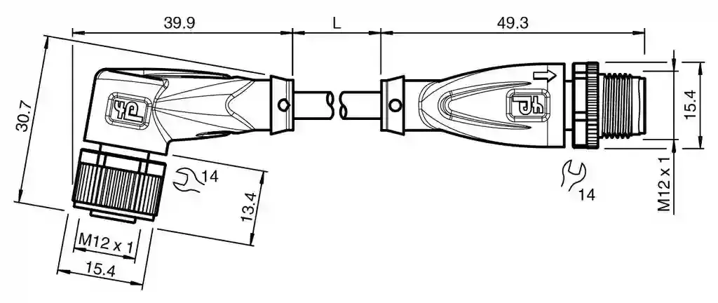 Connection cable. Cordset M12 socket angled to M12 plug straight A-coded, 4-pin, PUR cable black, UL-approved, drag chain suitable, torsion resistant. Connector 1: . ConnectionsocketConstruction typeM12StyleangledLockingscrew connectionNumber of pins4CodingA-coded: . Connection: socket. Construction type: M12. Style: angled. Locking: screw connection. Number of pins: 4. Coding: A-coded. Connector 2: . ConnectionplugConstruction typeM12StylestraightLockingscrew connectionNumber of pins4CodingA-coded: . Connection: plug. Construction type: M12. Style: straight. Locking: screw connection. Number of pins: 4. Coding: A-coded. Operating voltage: max. 250 V AC/DC. Operating current: max. 4 A. Degree of protection: EN 60529. Plug connection: connector M12 x 1 : IEC 61076-2-101. Flammability: UL 1581; DIN EN 60332-2-2. Halogen-free: IEC 60754-1. UL approval: AWM STYLE 20549 AWM I/II A/B 80°C 300V FT2 (cable). UL File Number: E231213. Ambient temperature: . Plug connector-40 … 90 °C (-40 … 194 °F)Cable, fixed installation-40 … 80 °C (-40 … 176 °F)Cable, flexing-20 … 80 °C (-4 … 176 °F): . Plug connector: -40 … 90 °C (-40 … 194 °F). Cable, fixed installation: -40 … 80 °C (-40 … 176 °F). Cable, flexing: -20 … 80 °C (-4 … 176 °F). Pollution degree: 3. Plug connector: . Tightening torque0.6 NmLoosening protectionintegratedTool installationstraight knurling and hexagon nut SW = 14 mmMating cyclesmin. 100: . Tightening torque: 0.6 Nm. Loosening protection: integrated. Tool installation: straight knurling and hexagon nut SW = 14 mm. Mating cycles: min. 100. Degree of protection: IP66 / IP68 / IP69. Cable: according to IEC/EN 60228 (DIN VDE 0295) class 6. Sheath diameter4.3 mmBending radius> 10 x cable diameter, movable installation > 5 x cable diameter, fixed installationSheath stripping forcemax. 80 N / 300 mmSheath colorblack (similar to RAL 9005)Number of cores4Core cross section0.34 mm2Cores colorCore 1: brown Core 2: white Core 3: blue Core 4: blackCore construction42 x 0.1 mm ∅LengthL1.5 mCable codeLi 9Y 11Y 4 x 0.34: . Sheath diameter: 4.3 mm. Bending radius: > 10 x cable diameter, movable installation > 5 x cable diameter, fixed installation. Sheath stripping force: max. 80 N / 300 mm. Sheath color: black (similar to RAL 9005). Number of cores: 4. Core cross section: 0.34 mm2. Cores color: Core 1: brown Core 2: white Core 3: blue Core 4: black. Core construction: 42 x 0.1 mm ∅. Length: 1.5 m. Cable code: Li 9Y 11Y 4 x 0.34. Drag chain suitability: . Test temperature25 °C (77 °F)Drag chain cyclesmin. 10000000Motion velocitymax. 3 m/sTraverse distancemax. 5 mAccelerationmax. 5 m/s2Torsion cyclesmin. 1000000Torsional stress± 180 °/m: . Test temperature: 25 °C (77 °F). Drag chain cycles: min. 10000000. Motion velocity: max. 3 m/s. Traverse distance: max. 5 m. Acceleration: max. 5 m/s2. Torsion cycles: min. 1000000. Torsional stress: ± 180 °/m. Mass: 60 g. PWIS free: yes. Halogen-free: yes. Plug connector: . Screw connectionZinc diecast, nickel-platedBodyTPU, blackSealFKMContact surfacegold plated (Au)FlammabilityV-2: . Screw connection: Zinc diecast, nickel-plated. Body: TPU, black. Seal: FKM. Contact surface: gold plated (Au). Flammability: V-2. Cable: . SheathingPUR based on polyetherCoresbare copper (Cu)Core insulationPPUV resistanceyesChemical resistancegoodOil resistanceyesCooling lubricant resistanceyesMicrobial resistanceyesHydrolysis resistanceyesFlammabilityFT2: . Sheathing: PUR based on polyether. Cores: bare copper (Cu). Core insulation: PP. UV resistance: yes. Chemical resistance: good. Oil resistance: yes. Cooling lubricant resistance: yes. Microbial resistance: yes. Hydrolysis resistance: yes. Flammability: FT2. Cable marking sleeve: 2x PUR transparent , fixed to cable