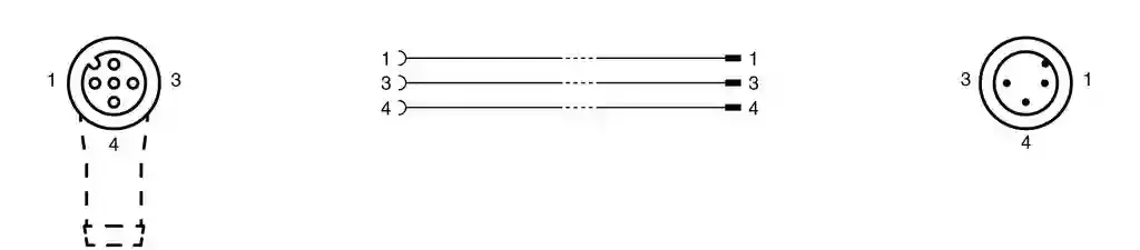 Connection cable. Cordset M12 socket angled to M12 plug straight A-coded, 3-pin, PUR cable black, UL approved, drag chain suitable, torsion resistant. Connector 1: . ConnectionsocketConstruction typeM12StyleangledLockingscrew connectionNumber of pins3CodingA-coded: . Connection: socket. Construction type: M12. Style: angled. Locking: screw connection. Number of pins: 3. Coding: A-coded. Connector 2: . ConnectionplugConstruction typeM12StylestraightLockingscrew connectionNumber of pins3CodingA-coded: . Connection: plug. Construction type: M12. Style: straight. Locking: screw connection. Number of pins: 3. Coding: A-coded. Operating voltage: max. 250 V AC/DC. Operating current: max. 4 A. Degree of protection: EN 60529. Plug connection: connector M12 x 1 : IEC 61076-2-101. Flammability: UL 1581; DIN EN 60332-2-2. Halogen-free: IEC 60754-1. UL approval: AWM STYLE 20549 AWM I/II A/B 80°C 300V FT2 (cable). UL File Number: E231213. Ambient temperature: . Plug connector-40 … 90 °C (-40 … 194 °F)Cable, fixed installation-40 … 80 °C (-40 … 176 °F)Cable, flexing-20 … 80 °C (-4 … 176 °F): . Plug connector: -40 … 90 °C (-40 … 194 °F). Cable, fixed installation: -40 … 80 °C (-40 … 176 °F). Cable, flexing: -20 … 80 °C (-4 … 176 °F). Pollution degree: 3. Plug connector: . Tightening torque0.6 NmLoosening protectionintegratedTool installationstraight knurling and hexagon nut SW = 14 mmMating cyclesmin. 100: . Tightening torque: 0.6 Nm. Loosening protection: integrated. Tool installation: straight knurling and hexagon nut SW = 14 mm. Mating cycles: min. 100. Degree of protection: IP66 / IP68 / IP69. Cable: according to IEC/EN 60228 (DIN VDE 0295) class 6. Sheath diameter4.3 mmBending radius> 10 x cable diameter, movable installation > 5 x cable diameter, fixed installationSheath stripping forcemax. 80 N / 300 mmSheath colorblack (similar to RAL 9005)Number of cores3Core cross section0.34 mm2Cores colorCore 1: brown Core 3: blue Core 4: blackCore construction42 x 0.1 mm ∅LengthL0.6 mCable codeLi F 9Y 11Y 3 x 0,34: . Sheath diameter: 4.3 mm. Bending radius: > 10 x cable diameter, movable installation > 5 x cable diameter, fixed installation. Sheath stripping force: max. 80 N / 300 mm. Sheath color: black (similar to RAL 9005). Number of cores: 3. Core cross section: 0.34 mm2. Cores color: Core 1: brown Core 3: blue Core 4: black. Core construction: 42 x 0.1 mm ∅. Length: 0.6 m. Cable code: Li F 9Y 11Y 3 x 0,34. Drag chain suitability: . Test temperature25 °C (77 °F)Drag chain cyclesmin. 10000000Motion velocitymax. 3 m/sTraverse distancemax. 5 mAccelerationmax. 5 m/s2Torsion cyclesmin. 1000000Torsional stress± 180 °/m: . Test temperature: 25 °C (77 °F). Drag chain cycles: min. 10000000. Motion velocity: max. 3 m/s. Traverse distance: max. 5 m. Acceleration: max. 5 m/s2. Torsion cycles: min. 1000000. Torsional stress: ± 180 °/m. Mass: 38 g. PWIS free: yes. Halogen-free: yes. Plug connector: . Screw connectionZinc diecast, nickel-platedBodyTPU, blackSealFKMContact surfacegold plated (Au)FlammabilityV-2: . Screw connection: Zinc diecast, nickel-plated. Body: TPU, black. Seal: FKM. Contact surface: gold plated (Au). Flammability: V-2. Cable: . SheathingPUR based on polyetherCoresbare copper (Cu)Core insulationPPUV resistanceyesChemical resistancegoodOil resistanceyesCooling lubricant resistanceyesMicrobial resistanceyesHydrolysis resistanceyesFlammabilityFT2: . Sheathing: PUR based on polyether. Cores: bare copper (Cu). Core insulation: PP. UV resistance: yes. Chemical resistance: good. Oil resistance: yes. Cooling lubricant resistance: yes. Microbial resistance: yes. Hydrolysis resistance: yes. Flammability: FT2. Cable marking sleeve: 2x PUR transparent , fixed to cable