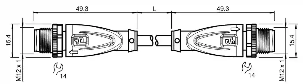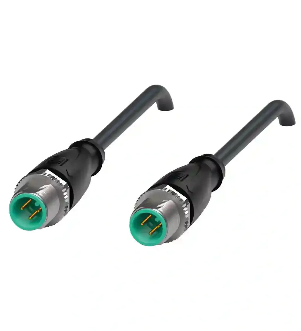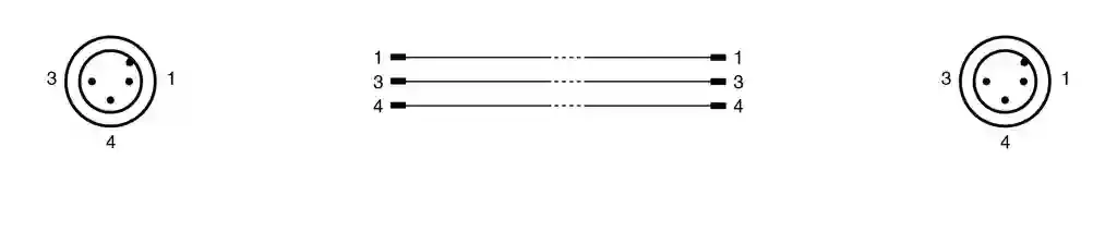 Connection cable. Cordset M12 plug straight to M12 plug straight A-coded, 3-pin, PUR cable black, UL approved, drag chain suitable, torsion resistant. Connector 1: . ConnectionplugConstruction typeM12StylestraightLockingscrew connectionNumber of pins3CodingA-coded: . Connection: plug. Construction type: M12. Style: straight. Locking: screw connection. Number of pins: 3. Coding: A-coded. Connector 2: . ConnectionplugConstruction typeM12StylestraightLockingscrew connectionNumber of pins3CodingA-coded: . Connection: plug. Construction type: M12. Style: straight. Locking: screw connection. Number of pins: 3. Coding: A-coded. Operating voltage: max. 250 V AC/DC. Operating current: max. 4 A. Degree of protection: EN 60529. Plug connection: connector M12 x 1 : IEC 61076-2-101. Flammability: UL 1581; DIN EN 60332-2-2. Halogen-free: IEC 60754-1. UL approval: AWM STYLE 20549 AWM I/II A/B 80°C 300V FT2 (cable). UL File Number: E231213. Ambient temperature: . Plug connector-40 … 90 °C (-40 … 194 °F)Cable, fixed installation-40 … 80 °C (-40 … 176 °F)Cable, flexing-20 … 80 °C (-4 … 176 °F): . Plug connector: -40 … 90 °C (-40 … 194 °F). Cable, fixed installation: -40 … 80 °C (-40 … 176 °F). Cable, flexing: -20 … 80 °C (-4 … 176 °F). Pollution degree: 3. Plug connector: . Tightening torque0.6 NmLoosening protectionintegratedTool installationstraight knurling and hexagon nut SW = 14 mmMating cyclesmin. 100: . Tightening torque: 0.6 Nm. Loosening protection: integrated. Tool installation: straight knurling and hexagon nut SW = 14 mm. Mating cycles: min. 100. Degree of protection: IP67 / IP68 / IP69. Cable: according to IEC/EN 60228 (DIN VDE 0295) class 6. Sheath diameter4.3 mmBending radius> 10 x cable diameter, movable installation > 5 x cable diameter, fixed installationSheath stripping forcemax. 80 N / 300 mmSheath colorblack (similar to RAL 9005)Number of cores3Core cross section0.34 mm2Cores colorCore 1: brown Core 3: blue Core 4: blackCore construction42 x 0.1 mm ∅LengthL9 mCable codeLi F 9Y 11Y 3 x 0,34: . Sheath diameter: 4.3 mm. Bending radius: > 10 x cable diameter, movable installation > 5 x cable diameter, fixed installation. Sheath stripping force: max. 80 N / 300 mm. Sheath color: black (similar to RAL 9005). Number of cores: 3. Core cross section: 0.34 mm2. Cores color: Core 1: brown Core 3: blue Core 4: black. Core construction: 42 x 0.1 mm ∅. Length: 9 m. Cable code: Li F 9Y 11Y 3 x 0,34. Drag chain suitability: . Test temperature25 °C (77 °F)Drag chain cyclesmin. 10000000Motion velocitymax. 3 m/sTraverse distancemax. 5 mAccelerationmax. 5 m/s2Torsion cyclesmin. 1000000Torsional stress± 180 °/m: . Test temperature: 25 °C (77 °F). Drag chain cycles: min. 10000000. Motion velocity: max. 3 m/s. Traverse distance: max. 5 m. Acceleration: max. 5 m/s2. Torsion cycles: min. 1000000. Torsional stress: ± 180 °/m. Mass: 0.34 g. PWIS free: yes. Halogen-free: yes. Plug connector: . Screw connectionZinc diecast, nickel-platedBodyTPU, blackContact surfacegold plated (Au)FlammabilityV-2: . Screw connection: Zinc diecast, nickel-plated. Body: TPU, black. Contact surface: gold plated (Au). Flammability: V-2. Cable: . SheathingPUR based on polyetherCoresbare copper (Cu)Core insulationPPUV resistanceyesChemical resistancegoodOil resistanceyesCooling lubricant resistanceyesMicrobial resistanceyesHydrolysis resistanceyesFlammabilityFT2: . Sheathing: PUR based on polyether. Cores: bare copper (Cu). Core insulation: PP. UV resistance: yes. Chemical resistance: good. Oil resistance: yes. Cooling lubricant resistance: yes. Microbial resistance: yes. Hydrolysis resistance: yes. Flammability: FT2. Cable marking sleeve: 2x PUR transparent , fixed to cable