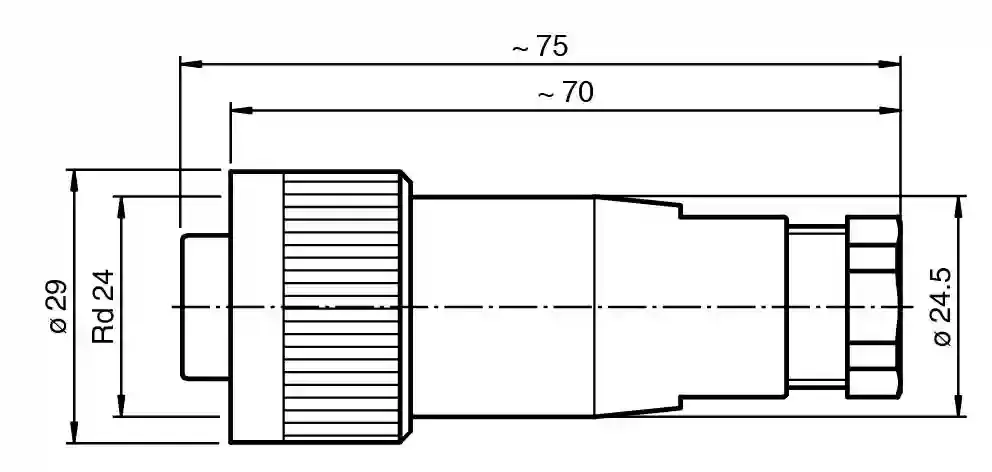 Female cordset, field attachable. Female connector, dia. 24, 6-pin+PE, field attachable. Number of pins: 6 + PE. Connection 1: socket. Construction type 1: straight. Threading 1: Rd 24. Operating volt…