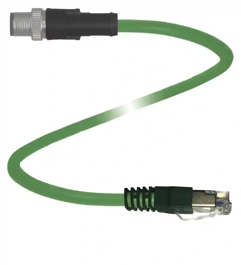 Connection cable, Ethernet. Ethernet bus cable M12 plug straight A-coded 8-pin to RJ45 plug straight 8-pin, PUR cable green, Cat6A, pairs shielded and overall shield, for connection of VOS cameras. Connector 1: . ConnectionplugConstruction typeM12StylestraightLockingscrew connectionNumber of pins8CodingA-coded: . Connection: plug. Construction type: M12. Style: straight. Locking: screw connection. Number of pins: 8. Coding: A-coded. Connector 2: . ConnectionplugConstruction typeRJ45StylestraightLockingsnap lockingNumber of pins8: . Connection: plug. Construction type: RJ45. Style: straight. Locking: snap locking. Number of pins: 8. UL File Number: E520112. Operating voltage: max. 50 V AC / 60 V DC. Operating current: max. 0.5 A. Degree of protection: EN 60529. Transmission technology: IEC 61156-6 / DIN EN 50288-4-2 , UL 1863. Plug connection: connector M12 x 1 : IEC 61076-2-109 connector RJ45 : IEC 60603-7. Component category: CAT6A (IEC 11801, EN 50173). Flammability: IEC 60332-1-2 , UL 1581. Ambient temperature: . Cable, fixed installation-40 … 85 °C (-40 … 185 °F)Cable, flexing-10 … 60 °C (14 … 140 °F): . Cable, fixed installation: -40 … 85 °C (-40 … 185 °F). Cable, flexing: -10 … 60 °C (14 … 140 °F). Pollution degree: 3. Connector 1: . Tightening torque0.6 NmTool installationstraight knurling , hexagon nut SW = 13 mmMating cyclesmin. 100Shieldingshield connected to screw connectionDegree of protectionIP67: . Tightening torque: 0.6 Nm. Tool installation: straight knurling , hexagon nut SW = 13 mm. Mating cycles: min. 100. Shielding: shield connected to screw connection. Degree of protection: IP67. Connector 2: . Loosening protectionavailableMating cyclesmin. 750Shieldingshield connected to connectorDegree of protectionIP20: . Loosening protection: available. Mating cycles: min. 750. Shielding: shield connected to connector. Degree of protection: IP20. Cable: according to IEC/EN 60228 (DIN VDE 0295) class 5. Sheath diameter6.2 mmBending radiusmax. 50 mm movable installationmax. 25 mm fixed installationSheath colorgreen (similar to RAL 6018)Number of cores8Core cross section0.14 mm2Cores colorCore 1: white/blue Core 2: white/brown Core 3: brown Core 4: orange Core 5: white/green Core 6: white/orange Core 7: blue Core 8: greenCore construction7 x 0.404 mm ∅ twisted pairs , twisted pair shieldShieldtinned copper braiding twisted pair shield : aluminum-lined polyester foilLengthL5 mCable codeLi 02YSC 11Y 4 x 2 x 0,14 (AWG26/7): . Sheath diameter: 6.2 mm. Bending radius: max. 50 mm movable installationmax. 25 mm fixed installation. Sheath color: green (similar to RAL 6018). Number of cores: 8. Core cross section: 0.14 mm2. Cores color: Core 1: white/blue Core 2: white/brown Core 3: brown Core 4: orange Core 5: white/green Core 6: white/orange Core 7: blue Core 8: green. Core construction: 7 x 0.404 mm ∅ twisted pairs , twisted pair shield. Shield: tinned copper braiding twisted pair shield : aluminum-lined polyester foil. Length: 5 m. Cable code: Li 02YSC 11Y 4 x 2 x 0,14 (AWG26/7). Mass: 235.8 g. Connector 1: . Screw connectionZinc diecast, nickel-platedBodyTPU, blackContact surfaceNi/AuFlammabilityV-2: . Screw connection: Zinc diecast, nickel-plated. Body: TPU, black. Contact surface: Ni/Au. Flammability: V-2. Connector 2: . BodyPCContact surfaceNi/AuFlammabilityV-0: . Body: PC. Contact surface: Ni/Au. Flammability: V-0. Cable: . SheathingPURCore insulationPEFlammabilityFT2: . Sheathing: PUR. Core insulation: PE. Flammability: FT2