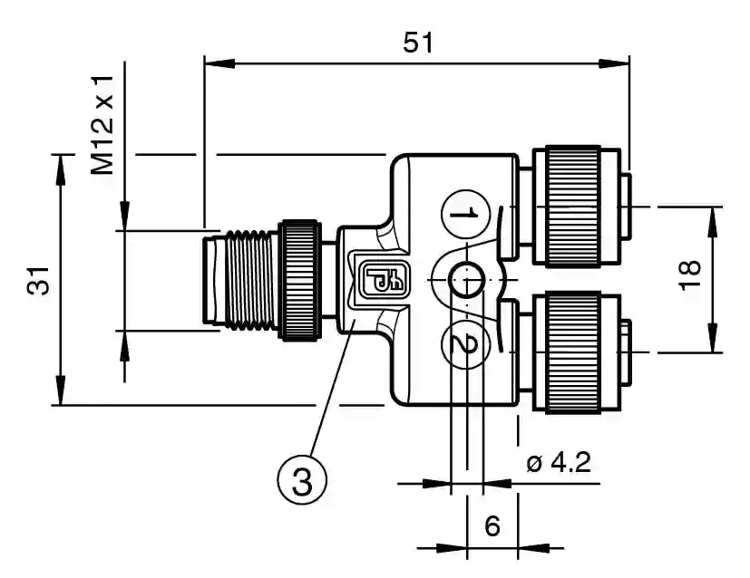 Y-Splitter. Y-Splitter M12 plug 4-pin to 2x M12 socket 3-pin A-coded. Connector 1: . ConnectionsocketConstruction typeM12StylestraightLockingscrew connectionNumber of pins3CodingA-coded: . Connection: socket. Construction type: M12. Style: straight. Locking: screw connection. Number of pins: 3. Coding: A-coded. Connector 2: . ConnectionsocketConstruction typeM12StylestraightLockingscrew connectionNumber of pins3CodingA-coded: . Connection: socket. Construction type: M12. Style: straight. Locking: screw connection. Number of pins: 3. Coding: A-coded. Connector 3: . ConnectionplugConstruction typeM12StylestraightLockingscrew connectionNumber of pins4CodingA-coded: . Connection: plug. Construction type: M12. Style: straight. Locking: screw connection. Number of pins: 4. Coding: A-coded. UL File Number: E231213. Operating voltage: max. 48 V AC / 60 V DC. Operating current: 4 A. Degree of protection: EN 60529. Plug connection: connector M12 x 1 : IEC 61076-2-101. Flammability: UL 94 , UL 758 / 1581. UL approval: UL Recognized General purpose. Maximum permissible operating voltagemax. 60 VMaximum permissible ambient temperaturemax. 80 °C (max. 176 °F): . Maximum permissible operating voltage: max. 60 V. Maximum permissible ambient temperature: max. 80 °C (max. 176 °F). Ambient temperature: -40 … 90 °C (-40 … 194 °F). Pollution degree: 3. Plug connector: . Tightening torque0.6 NmLoosening protectionavailableTool installationstraight knurlingMating cyclesmin. 100: . Tightening torque: 0.6 Nm. Loosening protection: available. Tool installation: straight knurling. Mating cycles: min. 100. Degree of protection: IP67. Mass: 26 g. Dimensions: . Width31 mmLength51 mm: . Width: 31 mm. Length: 51 mm. Mounting: Mounting hole for M4 screw. Plug connector: . Screw connectionZinc diecast, nickel-platedBodyTPUContact surfaceAuFlammabilityV-2: . Screw connection: Zinc diecast, nickel-plated. Body: TPU. Contact surface: Au. Flammability: V-2