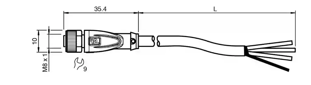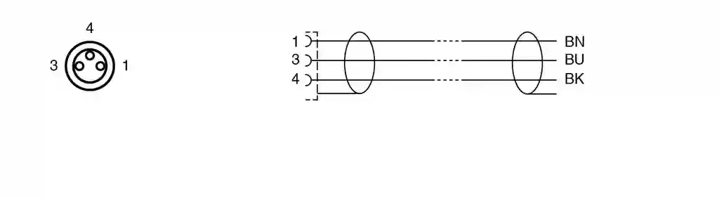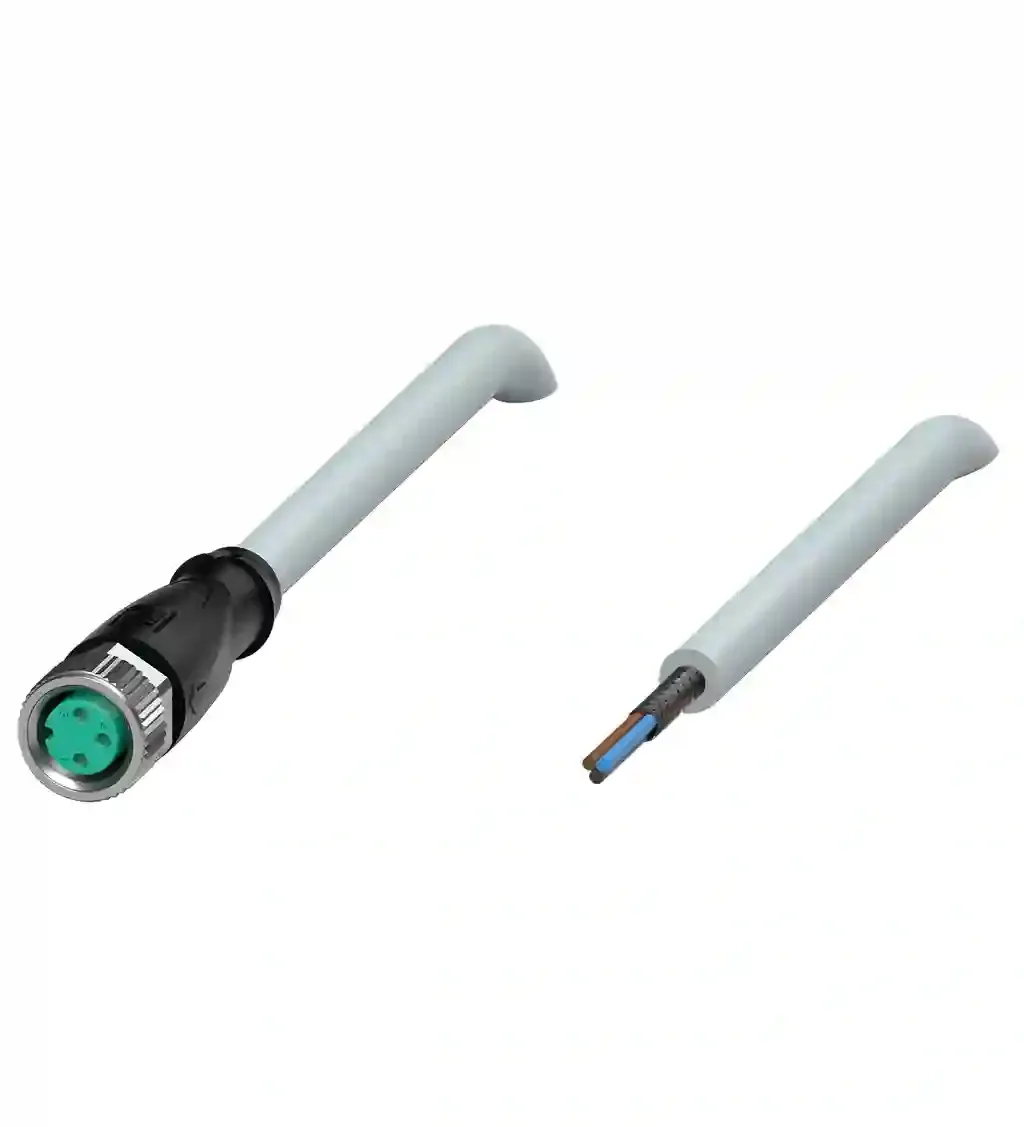 Cable socket, shielded. Female cordset single-ended M8 straight A-coded, 3-pin, PUR cable grey, shielded. Connector 1: . ConnectionsocketConstruction typeM8StylestraightLockingscrew connectionNumber of pins3CodingA-coded: . Connection: socket. Construction type: M8. Style: straight. Locking: screw connection. Number of pins: 3. Coding: A-coded. Connector 2: . Connectioncable end: . Connection: cable end. Operating voltage: max. 48 V AC / 60 V DC. Operating current: max. 3 A. Degree of protection: EN 60529. Plug connection: connector M8 x 1 : IEC 61076-2-104. Halogen-free: DIN VDE 0472-815 DIN EN 50267-2-1. Ambient temperature: . Plug connector-40 … 90 °C (-40 … 194 °F)Cable, fixed installation-40 … 80 °C (-40 … 176 °F)Cable, flexing-25 … 80 °C (-13 … 176 °F): . Plug connector: -40 … 90 °C (-40 … 194 °F). Cable, fixed installation: -40 … 80 °C (-40 … 176 °F). Cable, flexing: -25 … 80 °C (-13 … 176 °F). Pollution degree: 3. Plug connector: . Tightening torque0.4 NmLoosening protectionavailableTool installationstraight knurling and hexagon nut SW = 9 mmMating cyclesmin. 100Shieldingshield connected to screw connection: . Tightening torque: 0.4 Nm. Loosening protection: available. Tool installation: straight knurling and hexagon nut SW = 9 mm. Mating cycles: min. 100. Shielding: shield connected to screw connection. Degree of protection: IP68. Cable: according to IEC/EN 60228 (DIN VDE 0295) class 5. Sheath diameter4.8 mmBending radius> 10 x cable diameter, movable installation > 5 x cable diameter, fixed installationSheath stripping forcemax. 100 N / 300 mmSheath colorgrey (similar to RAL 7001)Number of cores4Core cross section0.34 mm2Cores colorCore 1: brown Core 2: white , not used Core 3: blue Core 4: blackCore construction19 x 0.15 mm ∅Shieldtinned copper braiding, 85 % coverageLengthL10 mCable codeLi 9Y 11YM 4 x 0.34: . Sheath diameter: 4.8 mm. Bending radius: > 10 x cable diameter, movable installation > 5 x cable diameter, fixed installation. Sheath stripping force: max. 100 N / 300 mm. Sheath color: grey (similar to RAL 7001). Number of cores: 4. Core cross section: 0.34 mm2. Cores color: Core 1: brown Core 2: white , not used Core 3: blue Core 4: black. Core construction: 19 x 0.15 mm ∅. Shield: tinned copper braiding, 85 % coverage. Length: 10 m. Cable code: Li 9Y 11YM 4 x 0.34. Mass: 368.02 g. Halogen-free: yes. Plug connector: . Screw connectionZinc diecast, nickel-platedBodyTPU, blackSealFKMContact surfacegold plated (Au)FlammabilityV-2: . Screw connection: Zinc diecast, nickel-plated. Body: TPU, black. Seal: FKM. Contact surface: gold plated (Au). Flammability: V-2. Cable: . SheathingPUR based on polyetherCore insulationPPChemical resistancegood: . Sheathing: PUR based on polyether. Core insulation: PP. Chemical resistance: good
