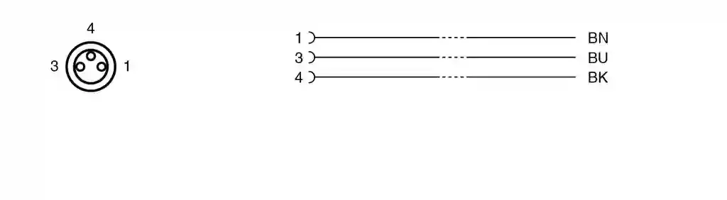 Female cordset. Female cordset single-ended M8 straight A-coded, 3-pin, PVC cable black, UL approved. Connector 1: . ConnectionsocketConstruction typeM8StylestraightLockingscrew connectionNumber of pins3CodingA-coded: . Connection: socket. Construction type: M8. Style: straight. Locking: screw connection. Number of pins: 3. Coding: A-coded. Connector 2: . Connectioncable end: . Connection: cable end. Operating voltage: max. 48 V AC / 60 V DC. Operating current: max. 3 A. Degree of protection: EN 60529. Plug connection: connector M8 x 1 : IEC 61076-2-104. Flammability: UL 1581 , IEC 60332-1-2. UL approval: AWM STYLE 2095 AWM I/II A/B 80°C 300V FT1 (cable). UL File Number: E231213. Ambient temperature: . Plug connector-40 … 90 °C (-40 … 194 °F)Cable, fixed installation-25 … 80 °C (-13 … 176 °F)Cable, flexing-5 … 80 °C (23 … 176 °F): . Plug connector: -40 … 90 °C (-40 … 194 °F). Cable, fixed installation: -25 … 80 °C (-13 … 176 °F). Cable, flexing: -5 … 80 °C (23 … 176 °F). Pollution degree: 3. Plug connector: . Tightening torque0.4 NmLoosening protectionavailableTool installationstraight knurling and hexagon nut SW = 9 mmMating cyclesmin. 100: . Tightening torque: 0.4 Nm. Loosening protection: available. Tool installation: straight knurling and hexagon nut SW = 9 mm. Mating cycles: min. 100. Degree of protection: IP68. Cable: according to IEC/EN 60228 (DIN VDE 0295) class 5. Sheath diameter4.3 mmBending radius> 15 x cable diameter, movable installation > 5 x cable diameter, fixed installationSheath stripping forcemax. 50 N / 300 mmSheath colorblack (similar to RAL 9005)Number of cores3Core cross section0.34 mm2Cores colorCore 1: brown Core 3: blue Core 4: blackCore construction19 x 0.15 mm ∅LengthL5 mCable codeLi YY 3 x 0,34: . Sheath diameter: 4.3 mm. Bending radius: > 15 x cable diameter, movable installation > 5 x cable diameter, fixed installation. Sheath stripping force: max. 50 N / 300 mm. Sheath color: black (similar to RAL 9005). Number of cores: 3. Core cross section: 0.34 mm2. Cores color: Core 1: brown Core 3: blue Core 4: black. Core construction: 19 x 0.15 mm ∅. Length: 5 m. Cable code: Li YY 3 x 0,34. Mass: 140 g. Plug connector: . Screw connectionZinc diecast, nickel-platedBodyTPU, blackSealFKMContact surfacegold plated (Au)FlammabilityV-2: . Screw connection: Zinc diecast, nickel-plated. Body: TPU, black. Seal: FKM. Contact surface: gold plated (Au). Flammability: V-2. Cable: . SheathingPVCCore insulationPVCFlammabilityFT1: . Sheathing: PVC. Core insulation: PVC. Flammability: FT1
