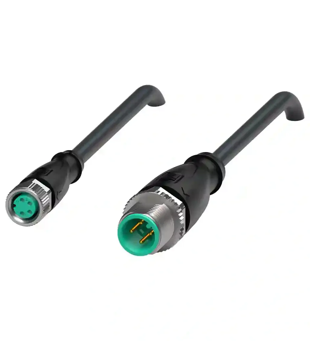 Connection cable. Cordset M8 socket straight to M12 plug straight A-coded, 4-pin, PVC cable black, UL approved. Connector 1: . ConnectionsocketConstruction typeM8StylestraightLockingscrew connectionNumber of pins4CodingA-coded: . Connection: socket. Construction type: M8. Style: straight. Locking: screw connection. Number of pins: 4. Coding: A-coded. Connector 2: . ConnectionplugConstruction typeM12StylestraightLockingscrew connectionNumber of pins4CodingA-coded: . Connection: plug. Construction type: M12. Style: straight. Locking: screw connection. Number of pins: 4. Coding: A-coded. Operating voltage: max. 30 V AC/DC. Operating current: max. 3 A. Degree of protection: EN 60529. Plug connection: connector M8 x 1 : IEC 61076-2-104 connector M12 x 1 : IEC 61076-2-101. Flammability: UL 1581 , IEC 60332-1-2. UL approval: AWM STYLE 2095 AWM I/II A/B 80°C 300V FT1 (cable). UL File Number: E231213. Ambient temperature: . Plug connector-40 … 90 °C (-40 … 194 °F)Cable, fixed installation-25 … 80 °C (-13 … 176 °F)Cable, flexing-5 … 80 °C (23 … 176 °F): . Plug connector: -40 … 90 °C (-40 … 194 °F). Cable, fixed installation: -25 … 80 °C (-13 … 176 °F). Cable, flexing: -5 … 80 °C (23 … 176 °F). Pollution degree: 3. Connector 1: . Tightening torque0.4 NmLoosening protectionavailableTool installationstraight knurling and hexagon nut SW = 9 mmMating cyclesmin. 100Degree of protectionIP68: . Tightening torque: 0.4 Nm. Loosening protection: available. Tool installation: straight knurling and hexagon nut SW = 9 mm. Mating cycles: min. 100. Degree of protection: IP68. Connector 2: . Tightening torque0.6 NmLoosening protectionavailableTool installationstraight knurling and hexagon nut SW = 14 mmMating cyclesmin. 100Degree of protectionIP68 / IP69: . Tightening torque: 0.6 Nm. Loosening protection: available. Tool installation: straight knurling and hexagon nut SW = 14 mm. Mating cycles: min. 100. Degree of protection: IP68 / IP69. Cable: according to IEC/EN 60228 (DIN VDE 0295) class 5. Sheath diameter4.3 mmBending radius> 15 x cable diameter, movable installation > 5 x cable diameter, fixed installationSheath stripping forcemax. 50 N / 300 mmSheath colorblack (similar to RAL 9005)Number of cores4Core cross section0.34 mm2Cores colorCore 1: brown Core 2: white Core 3: blue Core 4: blackCore construction19 x 0.15 mm ∅LengthL10 mCable codeLi YY 4 x 0,34: . Sheath diameter: 4.3 mm. Bending radius: > 15 x cable diameter, movable installation > 5 x cable diameter, fixed installation. Sheath stripping force: max. 50 N / 300 mm. Sheath color: black (similar to RAL 9005). Number of cores: 4. Core cross section: 0.34 mm2. Cores color: Core 1: brown Core 2: white Core 3: blue Core 4: black. Core construction: 19 x 0.15 mm ∅. Length: 10 m. Cable code: Li YY 4 x 0,34. Mass: 307.5 g. Plug connector: . Screw connectionZinc diecast, nickel-platedBodyTPU, blackSealFKMContact surfacegold plated (Au)FlammabilityV-2: . Screw connection: Zinc diecast, nickel-plated. Body: TPU, black. Seal: FKM. Contact surface: gold plated (Au). Flammability: V-2. Cable: . SheathingPVCCore insulationPVCFlammabilityFT1: . Sheathing: PVC. Core insulation: PVC. Flammability: FT1
