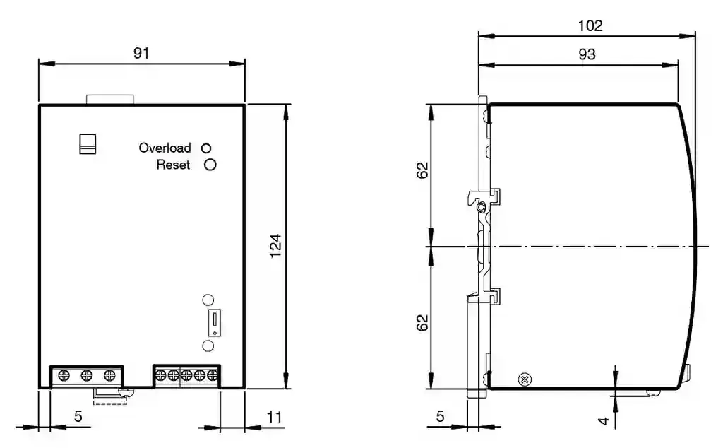 AS-Interface power supply. AS-Interface power supply, data decoupling, 8 A. UL File Number: E223176. MTBF: 100 a. Reset push-button switch: FUSE mode reset. Power selection switch: changeover switch for 115 V AC/230 V AC. LED Overload: red LED, flashes in the FUSE mode. LED IR on: red LED:ON: Plug-in jumper position 2-3OFF: Plug-in jumper position 1-2. Plug-in jumper: Position 1-2: Communication ModePosition 2-3: IR addressing. LED AS-i ok: operating display; LED green. Fusing: T8A/250 V AC HBC (not accessible). Capacity factor: > 0.5. Rated operating voltage: nominal: 100 … 120 V AC/220 … 240 V AC (front end selectable)permissible: 85 … 132 V AC/184 … 264 V AC/230 … 375 V DC. Rated operating current: 6,0 A (Switch position 115 V)2.8 A (Switch position 230 V). Supply frequency: 47 … 63 Hz or DC. Efficiency: typ. 92 % (at 230 V AC/8 A). Surge protection: limited to max. 55 V. Short-circuit protection/overload: FUSE Mode (2 … 5 s current, then trips). Current limit: > 8.4 A. Voltage: 30.55 V DC ± 3 %. Current: 8 A. Galvanic isolation: overvoltage category III. Residual ripple: ≤ 50 mVss (500 kHz bandwidth, 50-Ω-measurement with ohmic load). Short-circuit current: 12 … 25 A (max. 5 s). Electromagnetic compatibility: emitted interference in accordance with EN 50081-2 class B (EN 55011, EN 55022)noise immunity in accordance with EN 61000-6-2, EN 61000-4-2 to EN 61000-4-6, EN 61000-4-11. Ambient temperature: -10 … 70 °C (14 … 158 °F) (Measured 25 mm below the device)from 60° C 6W/°C power recovery necessary. Storage temperature: -25 … 85 °C (-13 … 185 °F). Pollution degree: 2. Degree of protection: IP20 according to EN 60529. Protection class: 1 (IEC 60536); Protective conductor connection necessary. Connection: Connection terminals, max. conductor cross-section flexible: 0.5 … 4 mm2fixed: 0.5 … 6 mm2stripped length 7 mm, connector sleeves are permissible. Material: . Housingmetal: . Housing: metal. Mass: approx. 890 g. Dimensions: . Height124 mmWidth91 mmLength102 mm: . Height: 124 mm. Width: 91 mm. Length: 102 mm