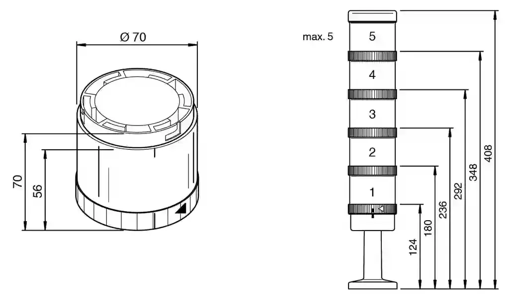 Stack light LED permanent light element. Stack light LED permanent light element, yellow. UL File Number: E223176. Color: yellow. MTTFd: 8700 a. Rated operating voltage: 24 V AC/DC. Rated operating current: ≤ 30 mA at 24 V DC 30 mA at 30.5 V (AS-Interface). Protection class: III. Electromagnetic compatibility: . Directive 2014/30/EUEN 60947-5-1 EN 60947-1: . Directive 2014/30/EU: EN 60947-5-1 EN 60947-1. Degree of protection: EN 60529. Ambient temperature: -20 … 50 °C (-4 … 122 °F). Degree of protection: IP65. Connection: Bayonet system. Dimensions: . Height70 mmDiameter70 mm: . Height: 70 mm. Diameter: 70 mm. Life span: Max. 50,000 hours = 5.7 years (continuous operation)
