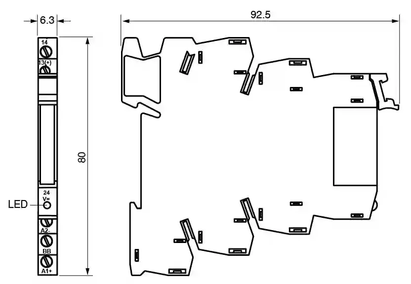 Optocoupler. Optocoupler to convert 120 V inputs to 24 VDC. Description: Optocoupler to convert 120 V inputs to 24 VDC. Voltage: 96 … 132 V AC / 88 … 121 V DC. Input current: 3.5 mA. Signal delay: 6 ms. Signal frequency: 10 Hz. Current limit: 100 mA. Voltage: 3 … 48 V DC. Current: approx. 0 mA. Voltage drop: ≤ 1 V. Degree of protection: IP20. Connection: Terminals. Dimensions: . Height92.5 mmWidth6.3 mmLength80 mm: . Height: 92.5 mm. Width: 6.3 mm. Length: 80 mm