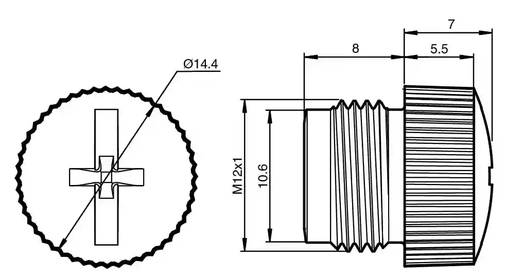 Blind plug. Blind plug for M12 sockets. Protection class: With this blind plug a specified IP protection of up to IP68/69K of a device can be achieved.. Connection: M12 x 1. Material: PA66 GF25, UL94V0. Installation: Phillips screwdriver H3, size 3 Flat-head screwdriver 1.2 x 8 or 1.6 x 10 Knurling tool MH V1-BIT M12. Tightening torque, fastening screws: 0.4 Nm