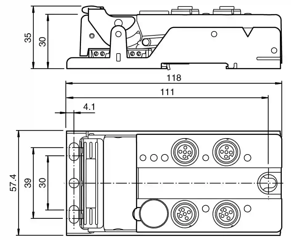 AS-Interface sensor module. G12 flat module, 4 inputs (PNP). Node type: A/B node. AS-Interface specification: V3.0. Required gateway specification: ≥ V2.1. Profile: S-0.A.2. IO code0ID codeAID1 code7ID2 code2: . IO code: 0. ID code: A. ID1 code: 7. ID2 code: 2. UL File Number: E223772. LED FAULT: error display; LED redred: communication error or address is 0red flashing: overload of sensor supply. LED PWR: AS-Interface voltage; green LEDgreen: voltage OKflashing green: address 0. LED IN: switching state (input); 4 LED yellow. Rated operating voltage: 26.5 … 31.6 V from AS-Interface. Rated operating current: ≤ 40 mA (without sensors) / max. 240 mA. Protection class: III. Surge protection: Ue: Over voltage category III, safe isolated power supplies (PELV) derived from mains up to 300 V AC line-to-neutral. Number/Type: 4 inputs for 2- or 3-wire sensors (PNP), DC option 2 inputs for 4-wire sensors (PNP), DC. Supply: from AS-Interface. Voltage: 21 … 31 V. Current loading capacity: ≤ 200 mA, overload and short-circuit protected. Input current: ≤ 8 mA (limited internally). Switching point: according to DIN EN 61131-2 (Type 2). 0 (unattenuated)≤ 2 mA1 (attenuated)≥ 6 mA: . 0 (unattenuated): ≤ 2 mA. 1 (attenuated): ≥ 6 mA. Signal delay: < 1 ms (input/AS-Interface). Electromagnetic compatibility: . Directive 2014/30/EUEN 62026-2:2013: . Directive 2014/30/EU: EN 62026-2:2013. Degree of protection: EN 60529:2000. Fieldbus standard: EN 62026-2:2013. Input: EN 61131-2. Emitted interference: EN 61000-6-4:2007. AS-Interface: EN 62026-2:2013. Noise immunity: EN 61000-6-2:2005 EN 62026-2:2013. Ambient temperature: -25 … 70 °C (-13 … 158 °F). Storage temperature: -25 … 85 °C (-13 … 185 °F). Relative humidity: 85 % , noncondensing. Altitude: ≤ 2000 m above MSL. Shock and impact resistance: 30 g, 11 ms in 6 spatial directions 3 shocks10 g, 16 ms in 6 spatial directions 1000 shocks. Vibration resistance: 0.75 mm 10 … 57 Hz , 5 g 57 … 150 Hz, 20 cycles. Pollution degree: 3. Degree of protection: IP67. Connection: cable piercing methodflat cable yellowinputs: M12 round connector. Material: . HousingPBT: . Housing: PBT. Mass: 200 g. Tightening torque, cable gland: 0.4 Nm. Dimensions: . Height35 mmWidth57.4 mmLength118 mm: . Height: 35 mm. Width: 57.4 mm. Length: 118 mm. Mounting: Mounting plate