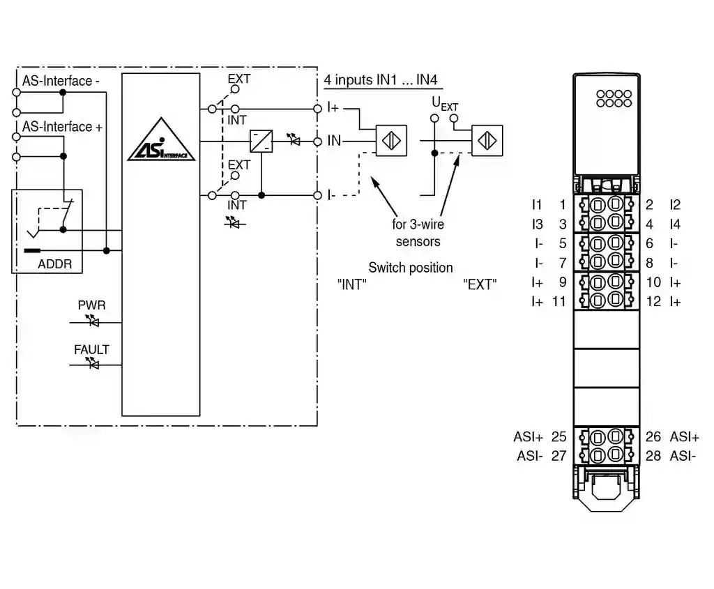 AS-Interface sensor/actuator module. Cabinet module, 4 inputs (PNP). Node type: A/B node. AS-Interface specification: V3.0. Required gateway specification: ≥ V3.0. UL File Number: E223772. MTBF: 368 a. LED FAULT: Fault display; Red LEDred: Communication fault or address is 0red, flashing: Overload, internal input supply. LED INT: Internal input supply active; LED green. LED PWR: AS-Interface voltage; green LEDgreen: voltage OKflashing green: address 0. LED IN: switching state (input); 4 LED yellow. Auxiliary voltage (input): 12 … 30 V DC PELV. Rated operating voltage: 26.5 … 31.6 V from AS-Interface. Rated operating current: ≤ 35 mA (without sensors) / max. 190 mA. Protection class: III. Surge protection: UEXT, Ue: Over voltage category III, safe isolated power supplies (PELV). Number/Type: 4 inputs for 3-wire sensors (PNP), DC. Supply: from AS-Interface (switch position INT, default settings) or external UEXT (switch position EXT). Voltage: 21 … 31 V DC (INT). Current loading capacity: ≤ 150 mA, overload- and short-circuit protected (INT). Input current: ≤ 5.6 mA (max.). Switching point: according to DIN EN 61131-2 (type 1). 0 (unattenuated)≤ 0.5 mA1 (attenuated)≥ 2 mA: . 0 (unattenuated): ≤ 0.5 mA. 1 (attenuated): ≥ 2 mA. Signal delay: < 1 ms (input/AS-Interface). Electromagnetic compatibility: . Directive 2014/30/EUEN 62026-2:2013: . Directive 2014/30/EU: EN 62026-2:2013. Degree of protection: EN 60529:2000. Fieldbus standard: EN 62026-2:2013. Input: EN 61131-2:2004. Emitted interference: EN 61000-6-4:2007. AS-Interface: EN 62026-2:2013. Noise immunity: EN 61000-6-2:2005, EN 61326-1:2006, EN 62026-2:2013. Profile: S-0.A.0. IO code: 0. ID code: A. ID1 code: 7. ID2 code: 0. Data bits (function via AS-Interface): InputOutput. D0 IN1D1 IN2D2 IN3D3 IN4: . D0: IN1. D1: IN2. D2: IN3. D3: IN4. Parameter bits (programmable via AS-i): function. P0not usedP1Input filterP1 = 0 input filter on, pulse suppression ≤ 2 msP1 = 1 input filter off (default settings)P2Synchronous modeP2 = 0 synchronous mode onP2 = 1 synchronous mode off (default settings)P3not used: . P0: not used. P1: Input filterP1 = 0 input filter on, pulse suppression ≤ 2 msP1 = 1 input filter off (default settings). P2: Synchronous modeP2 = 0 synchronous mode onP2 = 1 synchronous mode off (default settings). P3: not used. Ambient temperature: -25 … 70 °C (-13 … 158 °F). Storage temperature: -25 … 85 °C (-13 … 185 °F). Relative humidity: 85 % , noncondensing. Climatic conditions: For indoor use only. Altitude: ≤ 2000 m above MSL. Shock and impact resistance: 15 g, 11 ms in 6 spatial directions, 3 shocks 10 g, 16 ms in 6 spatial directions, 1000 shocks. Vibration resistance: 0.35 mm 10 … 57 Hz , 5 g 57 … 150 Hz, 20 cycles. Pollution degree: 2. Degree of protection: IP20 For safety applications: Installation in an enclosure with a minimum protection class of IP54 required. Connection: Removable push-in terminalsrated connection capacity:rigid: 0.20 mm2 … 1.5 mm2flexible (without wire end ferrule): 0.20 mm2 … 2.5 mm2flexible (with wire end ferrule): 0.25 mm2 … 1.5 mm2. Material: . HousingPA 66-FR: . Housing: PA 66-FR. Mass: 110 g. Dimensions: . Height100 mmWidth18.9 mmLength124 mm: . Height: 100 mm. Width: 18.9 mm. Length: 124 mm. Mounting: DIN mounting rail