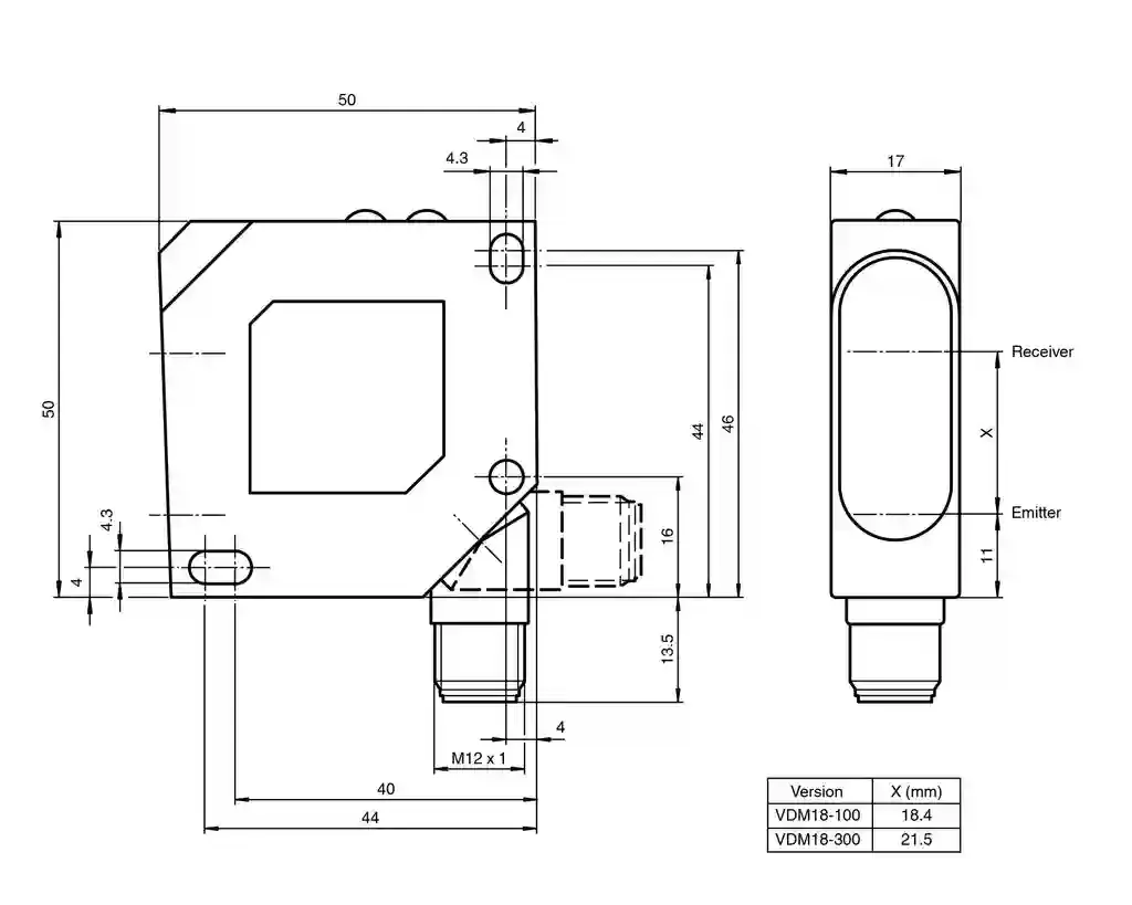 Distance sensor. Universal distance sensor, measurement to object, 300 mm detection range, red laser light, laser class 2, RS485 interface, 2 x PNP outputs, analog output, M12 plug, Analog output 4 mA…