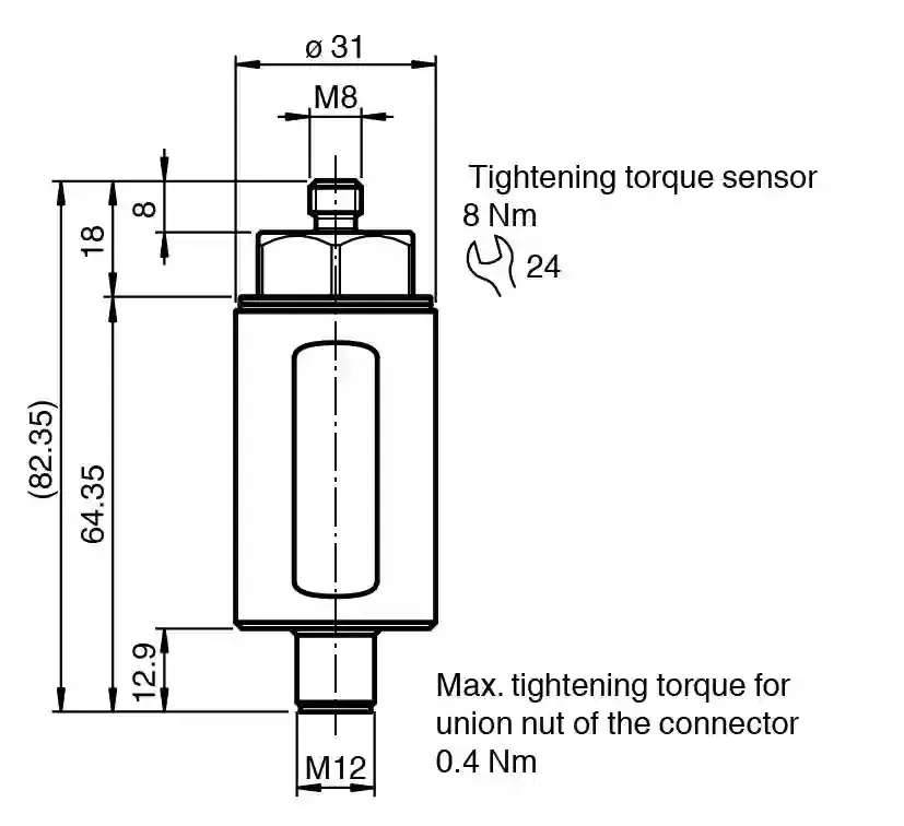 Vibration sensor. Vibration sensor with analog current output, increased temperature resistance, suitable up to Zone 1/21 with type of protection intrinsic safety, Series: Performance Plus Line, Measured variable: Vibration velocity, Output type: analog output, current output of the vibration variable, Equipment protection level Gb: IECEx CSAE 22.0042X, Equipment protection level Db: IECEx CSAE 22.0042X, Equipment protection level Gb: CSANe 21 ATEX 1074 X, Equipment protection level Db: CSANe 21 ATEX 1074 X. Type: Vibration sensor. Measuring technology: MEMS. Series: Performance Plus Line. Measured variable: Vibration velocity. Measuring range: . Vibration velocityv-rms0 … 16 mm/s: v-rms. Vibration velocity: 0 … 16 mm/s. Measurement accuracy: ± 0.1 mm/s (calibration point: 90% of the measuring range; 159.2 Hz) Complies with the tolerance requirements of DIN ISO 2954 for measuring range greater than 8 mm/s. Cross-sensitivity: < 5 % of the partial lateral acceleration, which acts exactly 90° to the measuring axis. Frequency range: 10 … 1000 Hz. Averaging time: for v-rms: 2 s. Fusing: external fuse is required: 3 A , semi-time-lag , 30 V DC. Operating voltage: 10 … 30 V DC. Current consumption: max. 25 mA. Power consumption: max. 750 mW. Time delay before availability: 10 s (rms filter is calculated intially with measurement data before they are available at the output). Surge protection: up to 2 kV. Output type: analog output, current output of the vibration variable. Output current: 4 … 20 mA. Load resistor: ≤ 500 Ω. Degree of protection: DIN EN 60529, IP66, IP67. Shock resistance: DIN EN 60068-2-27, 60 g, 6 ms. Vibration resistance: DIN EN 60068-2-6, 16.5 g, 10 … 1000 Hz. Vibration evaluation: DIN ISO 10816/20816. IECEx approval: . Equipment protection level GbIECEx CSAE 22.0042XEquipment protection level DbIECEx CSAE 22.0042X: . Equipment protection level Gb: IECEx CSAE 22.0042X. Equipment protection level Db: IECEx CSAE 22.0042X. ATEX approval: . Equipment protection level GbCSANe 21 ATEX 1074 XEquipment protection level DbCSANe 21 ATEX 1074 X: . Equipment protection level Gb: CSANe 21 ATEX 1074 X. Equipment protection level Db: CSANe 21 ATEX 1074 X. UL approval: . Ordinary LocationE468231 cULus Listed, Class III Power Source and limited energy , if UL marking is marked on the product. For use in NFPA 70 Applications only. adapters providing field wiring on requestMaximum permissible ambient temperaturemax. 60 °C (max. 140 °F): . Ordinary Location: E468231 cULus Listed, Class III Power Source and limited energy , if UL marking is marked on the product. For use in NFPA 70 Applications only. adapters providing field wiring on request. Maximum permissible ambient temperature: max. 60 °C (max. 140 °F). Ambient temperature: -40 … 60 °C (-40 … 140 °F). Measuring head temperature: -40 … 125 °C (-40 … 257 °F) directly at the mounting point. Storage temperature: -40 … 60 °C (-40 … 140 °F). Connection type: plug. Housing material: Stainless steel 1.4305 / AISI 303. Degree of protection: IP66 / IP67 only in connected state. Connector: . ThreadingM12Number of pins5: . Threading: M12. Number of pins: 5. Mass: approx. 200 g. Dimensions: . Length82.35 mmDiameter31 mm: . Length: 82.35 mm. Diameter: 31 mm. Use in the hazardous area: see instruction manuals Only use accessories specified by the manufacturer.
