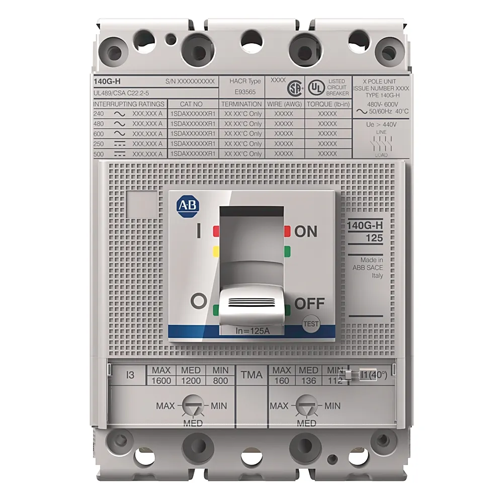 140G – Molded Case Circuit Breaker, H frame, 25 kA Interrupt Rating, T/M – Thermal Magnetic, 3 Poles, Rated Current 125 A, Shunt Trip 24…30V AC/DC