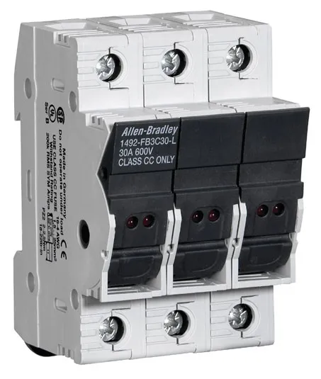 1492-FB Fuse Holder with 3 poles, 1 1/2″ x 13/32″ Midget Fuses, 30A, Fuse Block without Indication, 600V AC/DC (690V when used in IEC applications), Pkg. Qty. 4