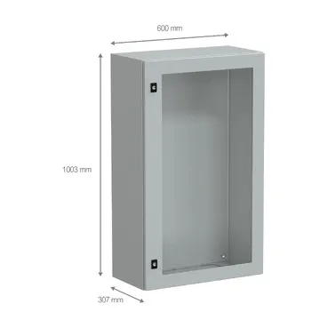 Spacial CRN steel wall-mounting enclosure for multi-purpose applications It is designed for use in harsh environments, withstanding high impact due to its IK08 (IEC62262) rating and high resistance to dust and water with an IP66 rating (IEC60529) This enclosure has a nominal height, width, and depth of 1000mm, 600mm, and 300mm, respectively The enclosure is grey-coloured (RAL7035) with an epoxy-polyester powder surface finish The enclosure consists of a body, a cable gland plate, a glazed door, and a lock The door is made of steel and security glass and can be opened up to 120°, allowing easy access to the equipment inside It is possible to change the opening side of the door (reversible) The door has a three-point lock with a 3mm double-bar insert The door and the cable gland plate can be removed for maintenance purposes The net weight of the enclosure is 25kg