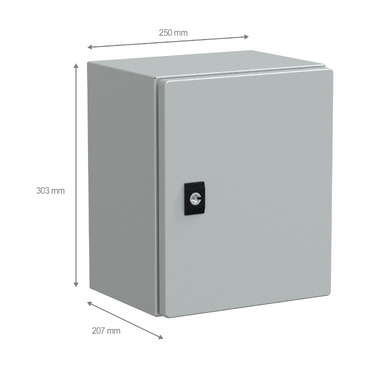 Spacial CRN steel wall-mounting enclosure for multi-purpose applications is designed for use in harsh environments, withstanding high impact due to its IK10 (IEC62262) rating and high resistance to dust and water with an IP66 rating (IEC60529) This enclosure has a nominal height, width, and depth of 300mm, 250mm, and 200mm, respectively The enclosure is grey-coloured (RAL7035) with an epoxy-polyester powder surface finish The enclosure consists of a body, a cable gland plate, a plain door, and a lock The door can be opened up to 120°, allowing easy access to the equipment inside It is possible to change the opening side of the door (reversible) The door has a three-point lock with a 3mm double-bar insert The door and the cable gland plate can be removed for maintenance purposes The net weight of the enclosure is 4,34kg