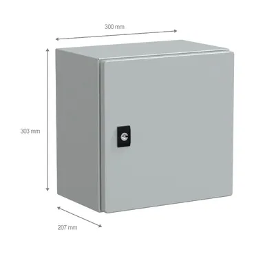 Spacial CRN steel wall-mounting enclosure is designed for multi-purpose applications, offering high impact protection with IK10 (IEC62262) and dust and water resistance with an IP66 rating (IEC60529) This enclosure has a nominal height, width, and depth of 300mm, 300mm, and 200mm, respectively The enclosure is grey-coloured (RAL7035) with an epoxy-polyester powder surface finish The enclosure consists of a body, a cable gland plate, a plain door, and a lock The door can be opened up to 120°, allowing easy access to the equipment inside The door has a three-point lock with a 3mm double-bar insert The door and the cable gland plate can be removed for maintenance purposes The net weight of the enclosure is 4,873kg This variant is designed with a back welded with double profile forming a protected sealed area and sides made from a single folded section The enclosure is accessible for operation from the front This compact enclosure is c.UL certified.