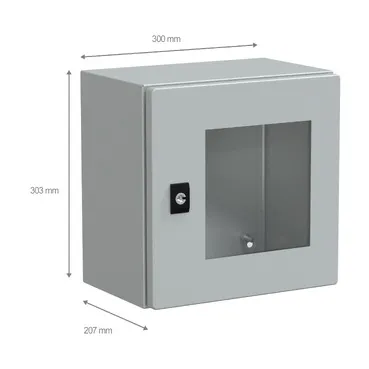 The Spacial CRN wall-mounting compact enclosure comes in grey colour and designed for multi-purpose application. This compact enclosure is composed of body, cable gland plate, door, lock. The compact enclosure is made of steel (body), steel and security glass (door), making it durable and resistant. It has IP66 and IK08 protection level, which can help protect against impact, water and dust. The dimensions are (W) 300 mm x (H) 300 mm x (D) 200 mm. It features a back welded with double profile forming a protected sealed area, sides made from a single folded section. The door type is glazed, it has 1 door(s) and the door opening side is reversible. Equipped with a 3 mm double-bar lock lock type. Featuring a epoxy-polyester powder surface finish, which ensures a bright, even and inviting finish.