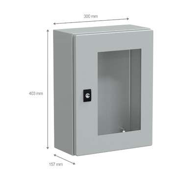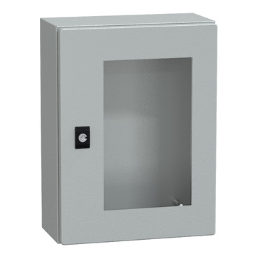Spacial CRN steel wall-mounting enclosure is designed for multi-purpose applications It has a nominal height, width, and depth of 400mm, 300mm, and 150mm, respectively The body is made of steel while the door is made of steel and security glass The enclosure is grey-coloured (RAL7035) with an epoxy-polyester powder surface finish The enclosure consists of a body, a cable gland plate, a glazed door, and a lock The door can be opened up to 120°, allowing easy access to the equipment inside It is possible to change the opening side of the door (reversible) The door has a three-point lock with a 3mm double-bar insert The door and the cable gland plate can be removed for maintenance purposes The net weight of the enclosure is 5,11kg