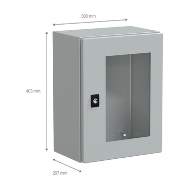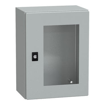 Spacial CRN steel wall-mounting enclosure is designed for multi-purpose applications It is designed for use in harsh environments, withstanding high impact due to its IK08 (IEC62262) rating and high resistance to dust and water with an IP66 rating (IEC60529) This enclosure has a nominal height, width, and depth of 400mm, 300mm, and 200mm, respectively The enclosure is grey-coloured (RAL7035) with an epoxy-polyester powder surface finish The enclosure consists of a body, a cable gland plate, a glazed door, and a lock The door can be opened up to 120°, allowing easy access to the equipment inside It is possible to change the opening side of the door (reversible) The door has a three-point lock with a 3mm double-bar insert The door and the cable gland plate can be removed for maintenance purposes The net weight of the enclosure is 5,758kg