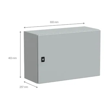 Spacial CRN steel wall-mounting enclosure for multi-purpose applications It is designed for use in harsh environments, withstanding high impact due to its IK10 (IEC62262) rating and high resistance to dust and water with an IP66 rating (IEC60529) This enclosure has a nominal height, width, and depth of 400mm, 600mm, and 250mm, respectively The enclosure is grey-coloured (RAL7035) with an epoxy-polyester powder surface finish The enclosure consists of a body, a cable gland plate, a plain door, and a lock The door can be opened up to 120°, allowing easy access to the equipment inside It is possible to change the opening side of the door (reversible) The door has a three-point lock with a 3mm double-bar insert The door and the cable gland plate can be removed for maintenance purposes The net weight of the enclosure is 10,816kg