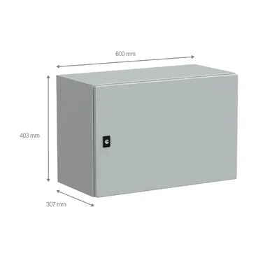 Spacial CRN steel wall-mounting enclosure for multi-purpose applications It is designed for use in harsh environments, withstanding high impact due to its IK10 (IEC62262) rating and high resistance to dust and water with an IP66 rating (IEC60529) This enclosure has a nominal height, width, and depth of 400mm, 600mm, and 300mm, respectively The enclosure is grey-coloured (RAL7035) with an epoxy-polyester powder surface finish The enclosure consists of a body, a cable gland plate, a plain door, and a lock The door can be opened up to 120°, allowing easy access to the equipment inside It is possible to change the opening side of the door (reversible) The door has a three-point lock with a 3mm double-bar insert The door and the cable gland plate can be removed for maintenance purposes The net weight of the enclosure is 11,616kg