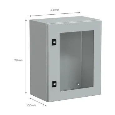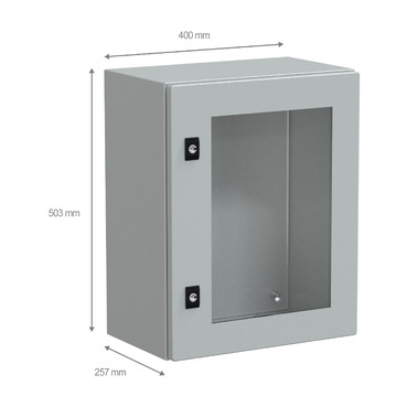 Spacial CRN steel wall-mounting enclosure for multi-purpose applications It is designed for use in harsh environments, withstanding high impact due to its IK08 (IEC62262) rating and high resistance to dust and water with an IP66 rating (IEC60529) This enclosure has a nominal height, width, and depth of 500mm, 400mm, and 250mm, respectively The enclosure is grey-coloured (RAL7035) with an epoxy-polyester powder surface finish The enclosure consists of a body, a cable gland plate, a glazed door, and a lock The door is made from steel and security glass and can be opened up to 120°, allowing easy access to the equipment inside It is possible to change the opening side of the door (reversible) The door has a three-point lock with a 3mm double-bar insert The door and the cable gland plate can be removed for maintenance purposes The net weight of the enclosure is 9,444kg