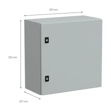 Spacial CRN is a multi-purpose steel wall-mounting enclosure designed for use in harsh environments It is UL, cUL, and DNV-GL certified, with an IK10 (IEC62262) rating and an IP66 rating (IEC60529) This enclosure has a nominal height, width, and depth of 500mm, 500mm, and 250mm, respectively The enclosure is grey-coloured (RAL7035) with an epoxy-polyester powder surface finish The enclosure consists of a body, a cable gland plate, a plain door with lock, and a mounting plate It is possible to change the opening side of the door (reversible) The door has a three-point lock with a 3mm double-bar insert The door and the cable gland plate can be removed for maintenance purposes The mounting plate is made of galvanized steel and is fixed with a fixing element The net weight of the enclosure is 13,832kg This compact enclosure is c.UL certified.