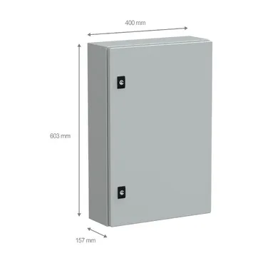 Spacial CRN steel wall-mounting enclosure for multi-purpose applications It is designed for use in harsh environments, withstanding high impact due to its IK10 (IEC62262) rating and high resistance to dust and water with an IP66 rating (IEC60529) This enclosure has a nominal height, width, and depth of 600mm, 400mm, and 150mm, respectively The enclosure is grey-coloured (RAL7035) with an epoxy-polyester powder surface finish The enclosure consists of a body, a cable gland plate, a plain door, and a lock The door can be opened up to 120°, allowing easy access to the equipment inside It is possible to change the opening side of the door (reversible) The door has a three-point lock with a 3mm double-bar insert The door and the cable gland plate can be removed for maintenance purposes The net weight of the enclosure is 8,45kg