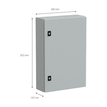 Spacial CRN steel wall-mounting enclosure for multi-purpose applications It is designed for use in harsh environments, withstanding high impact due to its IK10 (IEC62262) rating and high resistance to dust and water with an IP66 rating (IEC60529) This enclosure has a nominal height, width, and depth of 600mm, 400mm, and 150mm, respectively The enclosure is grey-coloured (RAL7035) with an epoxy-polyester powder surface finish The enclosure consists of a body, a cable gland plate, a plain door with a lock, and a mounting plate It is possible to change the opening side of the door (reversible) The door has a three-point lock with a 3mm double-bar insert The door, cable gland plate, and mounting plate can be removed for maintenance purposes The mounting plate is made of galvanised steel The net weight of the enclosure is 11,69kg This compact enclosure is c.UL certified.