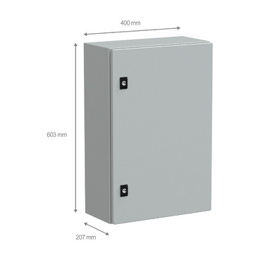 Spacial CRN is a multi-purpose steel wall-mounting enclosure designed for use in harsh environments It is certified by cUL, UL, and DNV-GL and has an IK10 rating (IEC62262) and an IP66 rating (IEC60529) This enclosure has a nominal height, width, and depth of 600mm, 400mm, and 200mm, respectively The enclosure is grey-coloured (RAL7035) with an epoxy-polyester powder surface finish It consists of a body, a cable gland plate, a plain door with a lock, and a galvanised steel mounting plate The door can be opened up to 120°, allowing easy access to the equipment inside It is possible to change the opening side of the door (reversible)