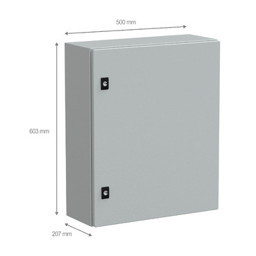 Spacial CRN steel wall-mounting enclosure for multi-purpose applications It is designed for use in harsh environments, withstanding high impact due to its IK10 (IEC62262) rating and high resistance to dust and water with an IP66 rating (IEC60529) This enclosure has a nominal height, width, and depth of 600mm, 500mm, and 200mm, respectively The enclosure is grey-coloured (RAL7035) with an epoxy-polyester powder surface finish The enclosure consists of a body, a cable gland plate, a plain door with a lock, and a mounting plate It is possible to change the opening side of the door (reversible) The door has a three-point lock with a 3mm double-bar insert The door, the cable gland plate, and the mounting plate can be removed for maintenance purposes The mounting plate is made of galvanised steel and is plain The net weight of the enclosure is 15kg This compact enclosure is c.UL certified.