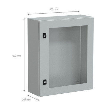 The Spacial CRN wall-mounting compact enclosure comes in grey colour and designed for multi-purpose application. This compact enclosure is composed of body, cable gland plate, door, lock. The compact enclosure is made of steel (body), steel and security glass (door), making it durable and resistant. It has IP66 and IK08 protection level, which can help protect against impact, water and dust. The dimensions are (W) 500 mm x (H) 600 mm x (D) 200 mm. It features a back welded with double profile forming a protected sealed area, sides made from a single folded section. The door type is glazed, it has 1 door(s) and the door opening side is reversible. Equipped with a 3 mm double-bar lock lock type. Featuring a epoxy-polyester powder surface finish, which ensures a bright, even and inviting finish.