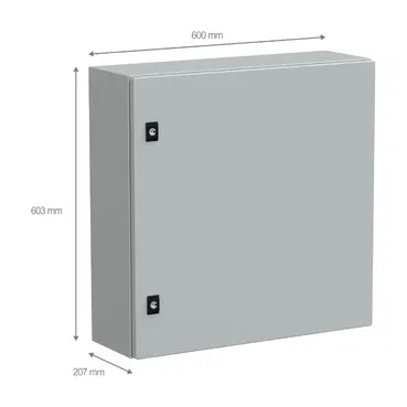 Spacial CRN steel wall-mounting enclosure for multi-purpose applications It is designed for use in harsh environments, withstanding high impact due to its IK10 (IEC62262) rating and high resistance to dust and water with an IP66 rating (IEC60529) This enclosure has a nominal height, width, and depth of 600mm, 600mm, and 200mm, respectively The enclosure is grey-coloured (RAL7035) with an epoxy-polyester powder surface finish The enclosure consists of a body, a cable gland plate, a plain door, and a lock The door can be opened up to 120°, allowing easy access to the equipment inside It is possible to change the opening side of the door (reversible) The door has a three-point lock with a 3mm double-bar insert The door and the cable gland plate can be removed for maintenance purposes The net weight of the enclosure is 13,564kg