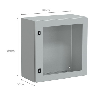 The Spacial CRN wall-mounting compact enclosure comes in grey colour and designed for multi-purpose application. This compact enclosure is composed of body, cable gland plate, door, lock. The compact enclosure is made of steel (body), steel and security glass (door), making it durable and resistant. It has IP66 and IK08 protection level, which can help protect against impact, water and dust. The dimensions are (W) 600 mm x (H) 600 mm x (D) 300 mm. It features a back welded with double profile forming a protected sealed area, sides made from a single folded section. The door type is glazed, it has 1 door(s) and the door opening side is reversible. Equipped with a 3 mm double-bar lock lock type. Featuring a epoxy-polyester powder surface finish, which ensures a bright, even and inviting finish.