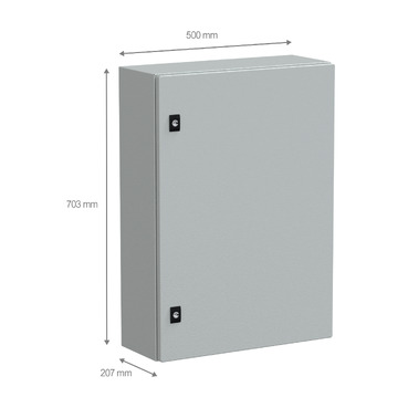 Spacial CRN steel wall-mounting enclosure for multi-purpose applications It is designed for use in harsh environments, withstanding high impact due to its IK10 (IEC62262) rating and high resistance to dust and water with an IP66 rating (IEC60529) This enclosure has a nominal height, width, and depth of 700mm, 500mm, and 200mm, respectively The enclosure is grey-coloured (RAL7035) with an epoxy-polyester powder surface finish The enclosure consists of a body, a cable gland plate, a plain door with a lock, and a galvanised steel mounting plate It is possible to change the opening side of the door (reversible) The door has a three-point lock with a 3mm double-bar insert The door and the cable gland plate can be removed for maintenance purposes, and the mounting plate can be removed using a fixing element The net weight of the enclosure is 18kg This device is qualified as a green premium product, with minimal use of hazardous substances. This compact enclosure is c.UL certified.