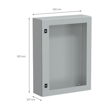 Spacial CRN steel wall-mounting enclosure for multi-purpose applications It is designed for use in harsh environments, withstanding high impact due to its IK08 (IEC62262) rating and high resistance to dust and water with an IP66 rating (IEC60529) This enclosure has a nominal height, width, and depth of 800mm, 600mm, and 200mm, respectively The enclosure is grey-coloured (RAL7035) with an epoxy-polyester powder surface finish The enclosure consists of a body, a cable gland plate, a glazed door, and a lock The door can be opened up to 120°, allowing easy access to the equipment inside It is possible to change the opening side of the door (reversible) The door has a three-point lock with a 3mm double-bar insert The door and the cable gland plate can be removed for maintenance purposes The door is made from steel and security glass